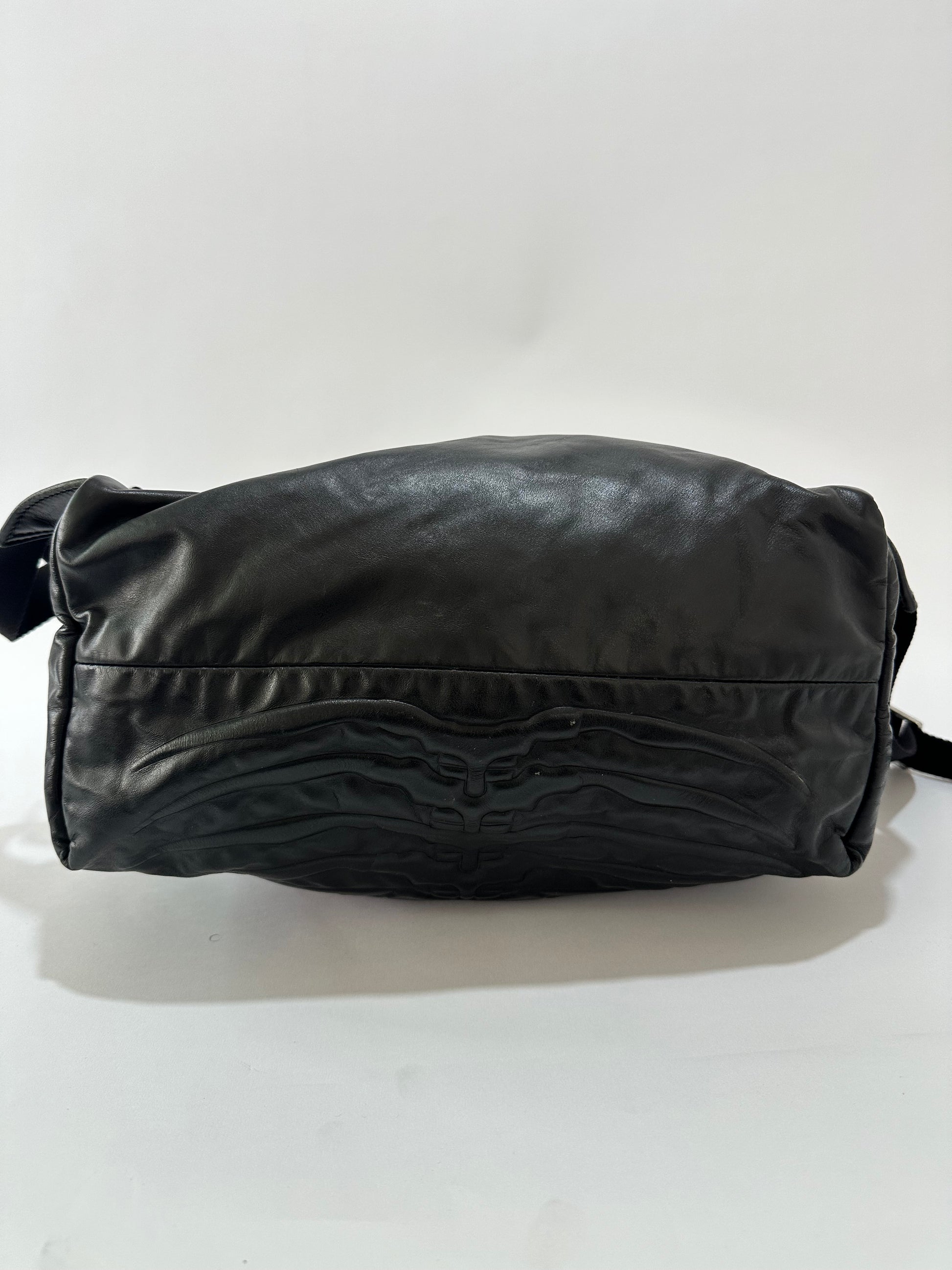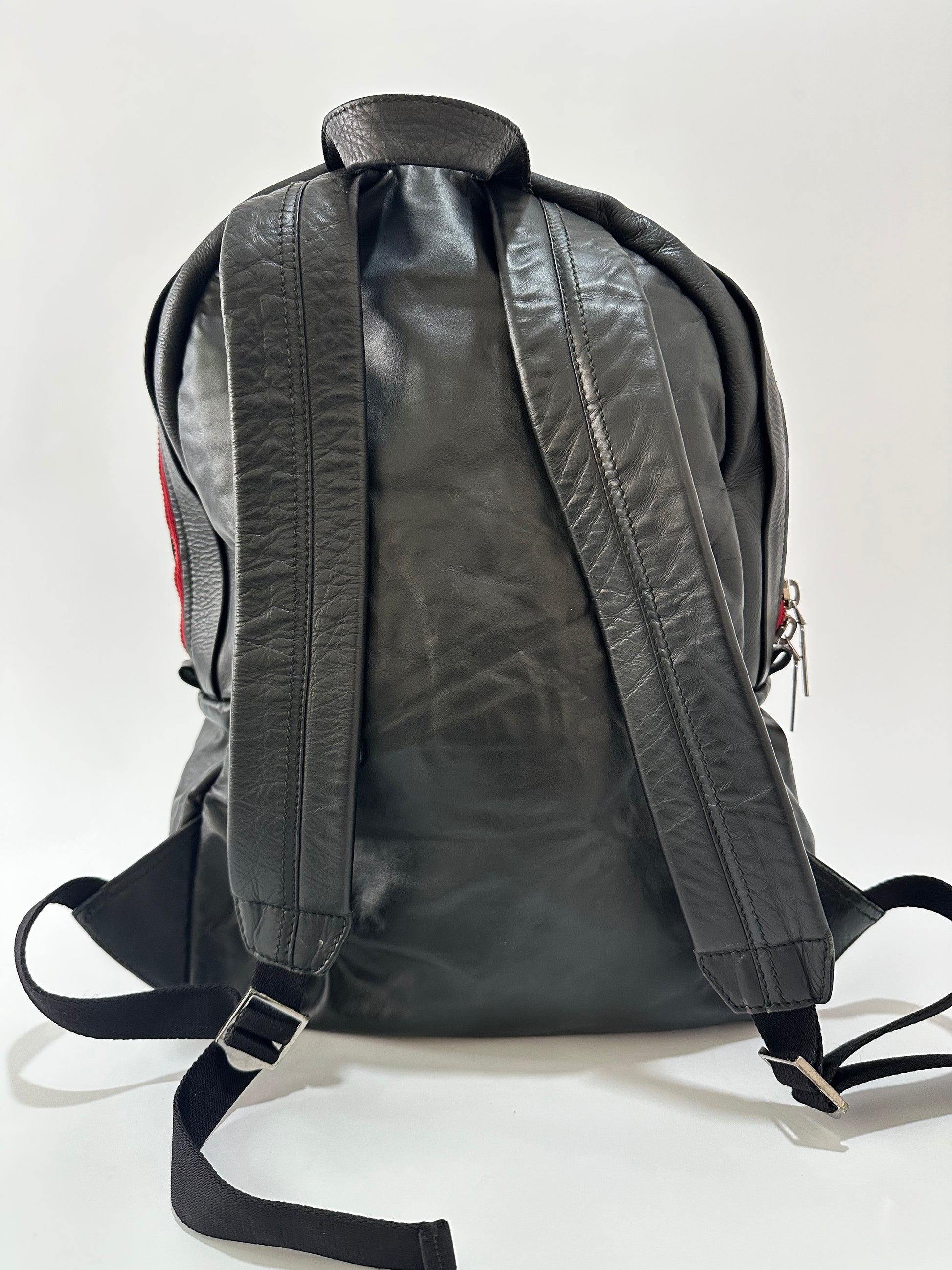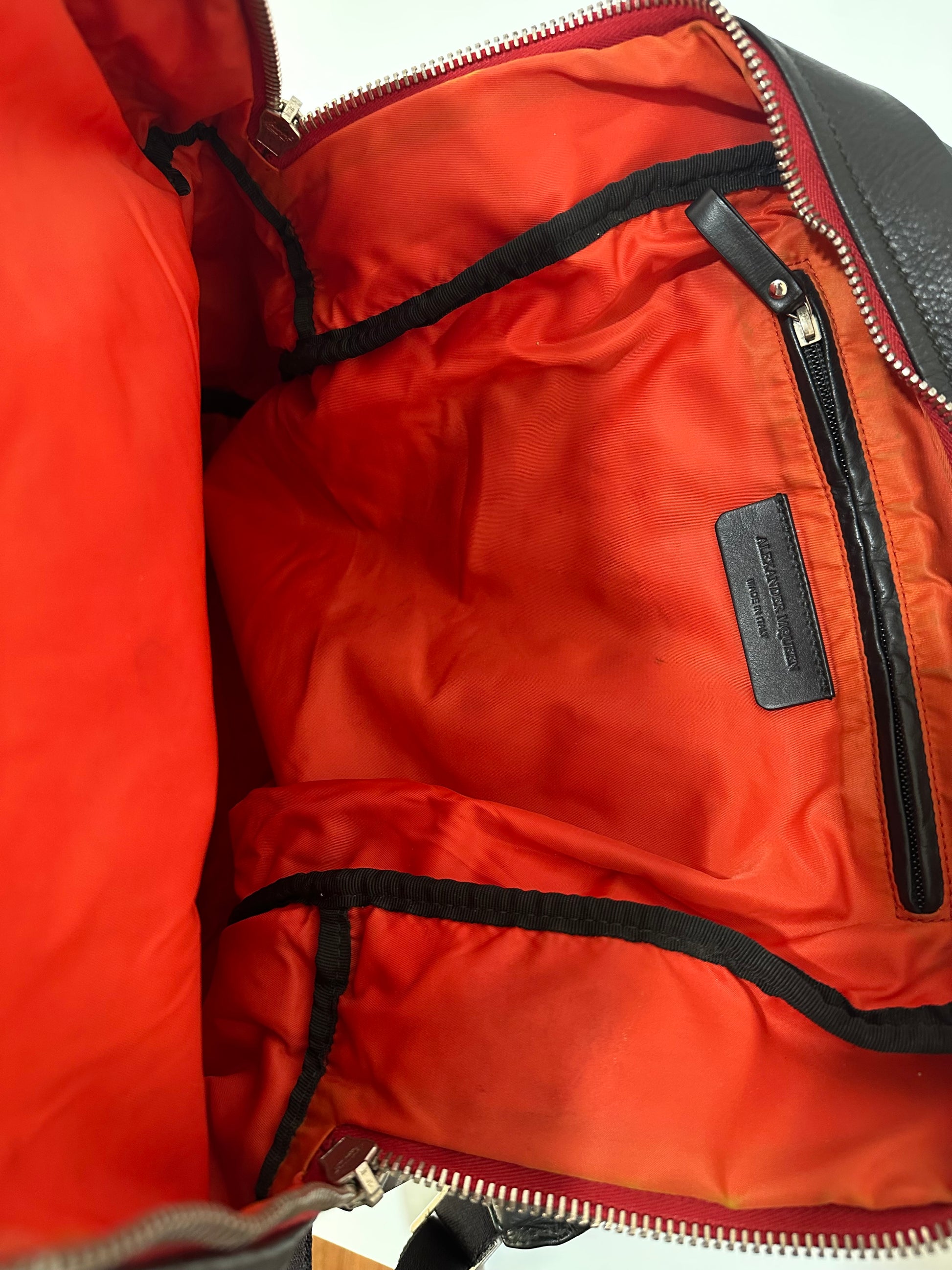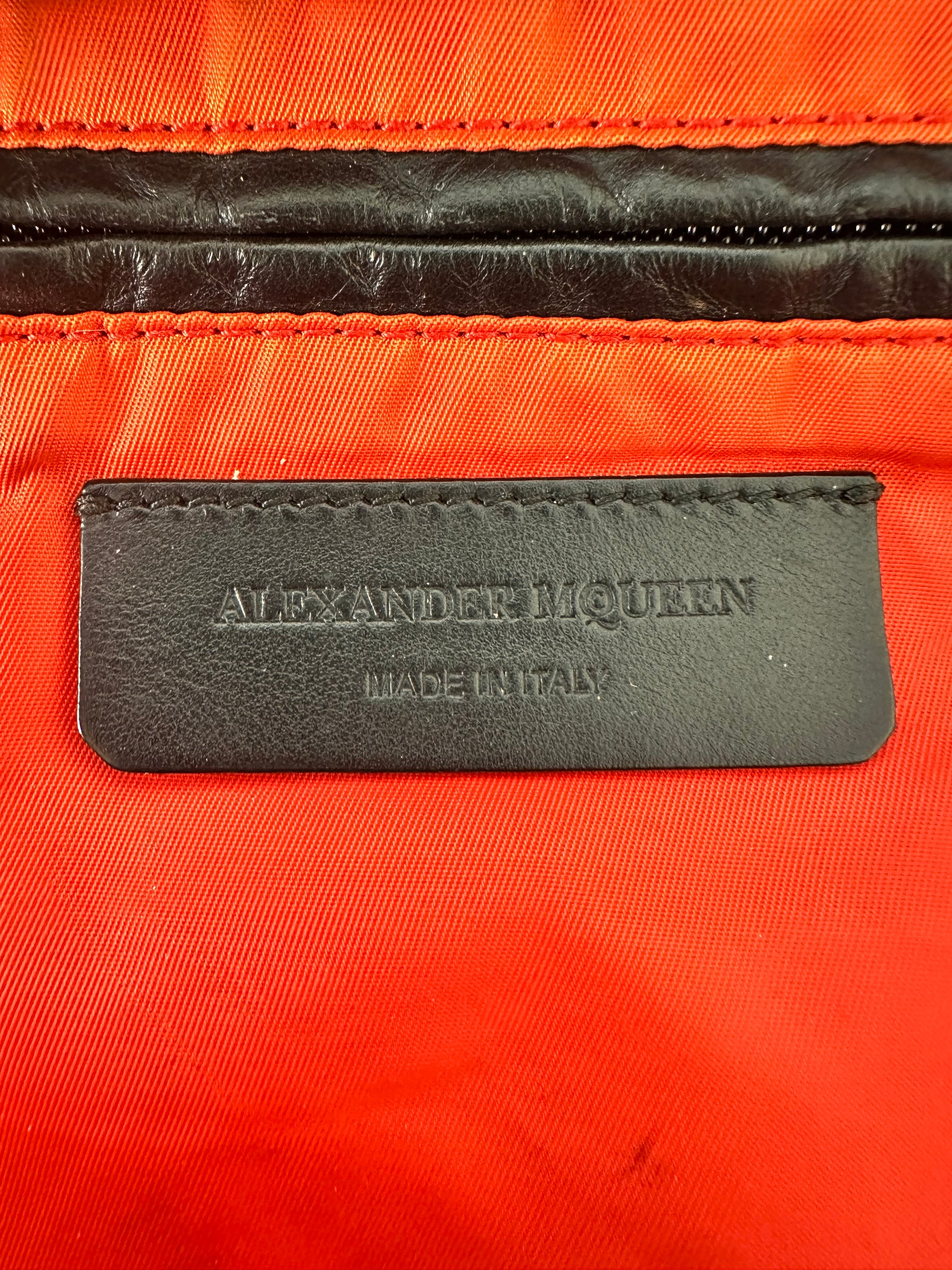 Embossed with their dramatic ribcage motif, this luxurious leather backpack by Alexander McQueenexudes their theatrical style. Crafted in Italy, the vibrant red interior boasts is functional for everyday use, offering plenty of storage space and an inner zip compartment to keep technology close to hand. Finished with contrasting coloured zip and branded silver zip pulls.