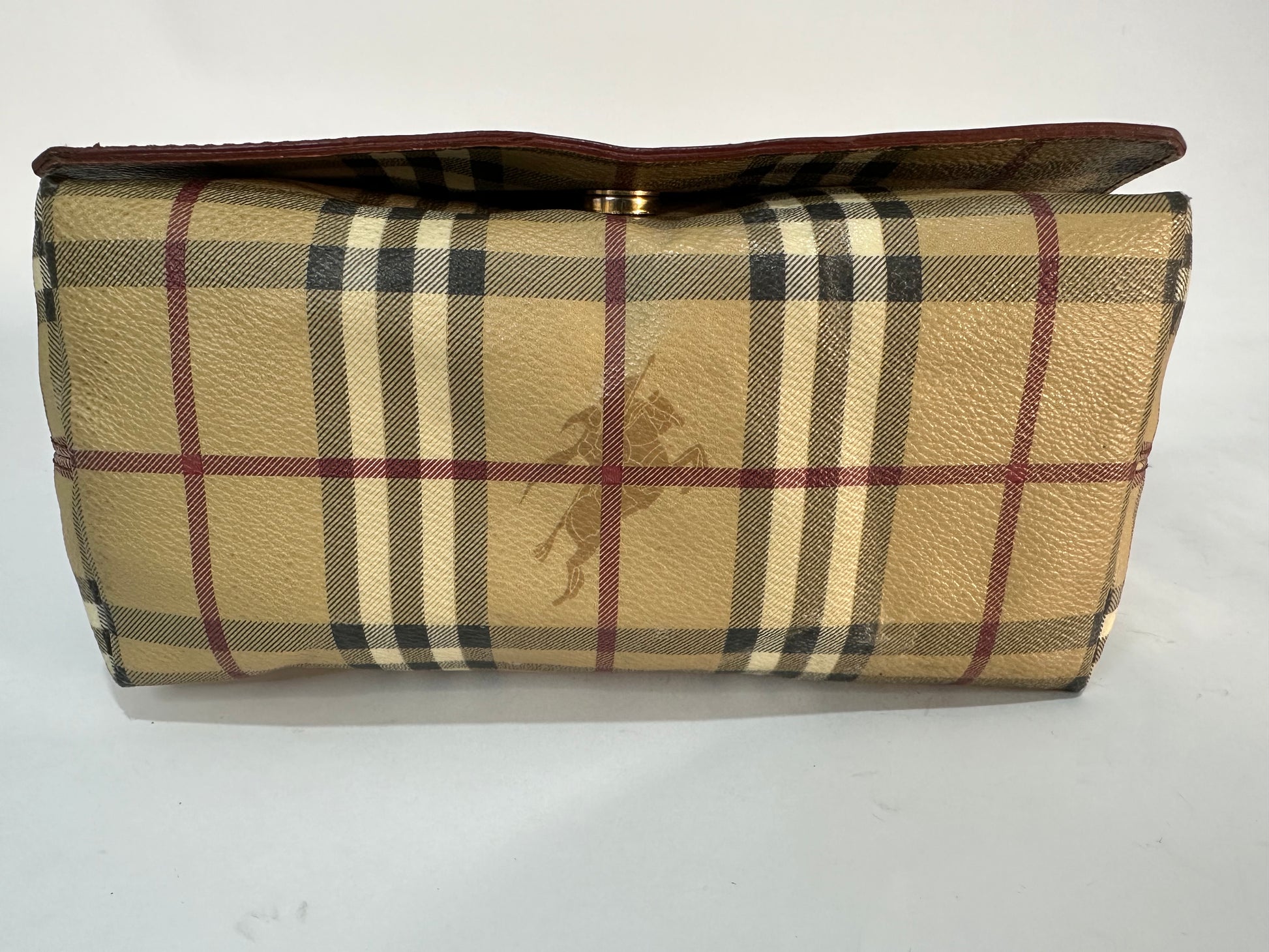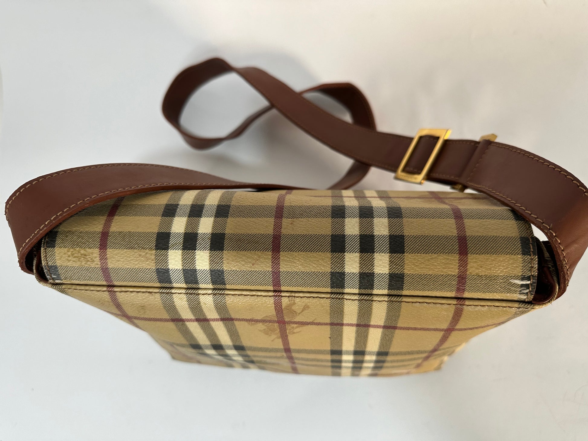 Complete your look with this bag from Burberry. It has been crafted from Haymarket Check PVC and tan leather trims. The bag features a top handle and the flap closure opens to a fabric-lined interior that houses a zip pocket.