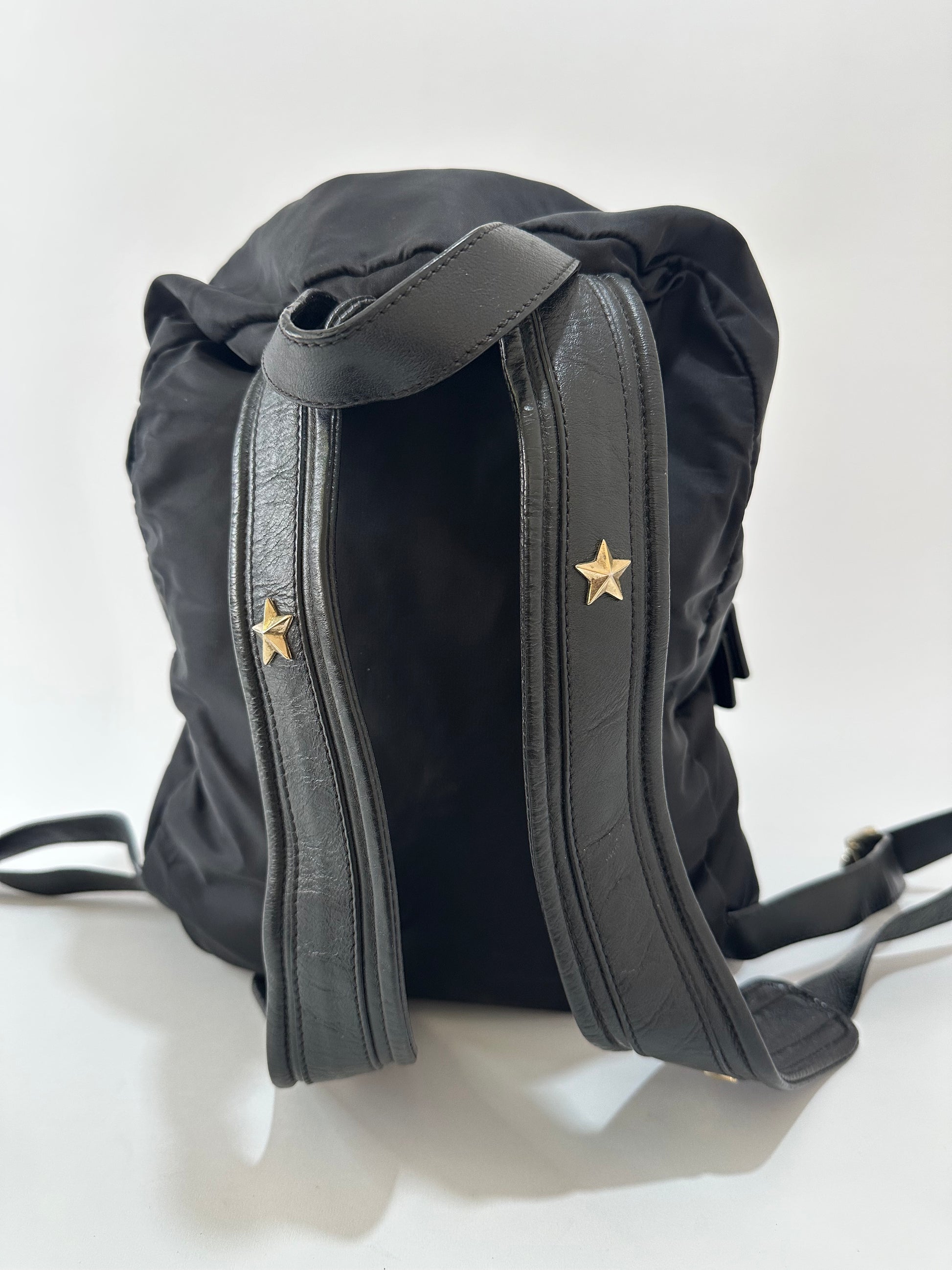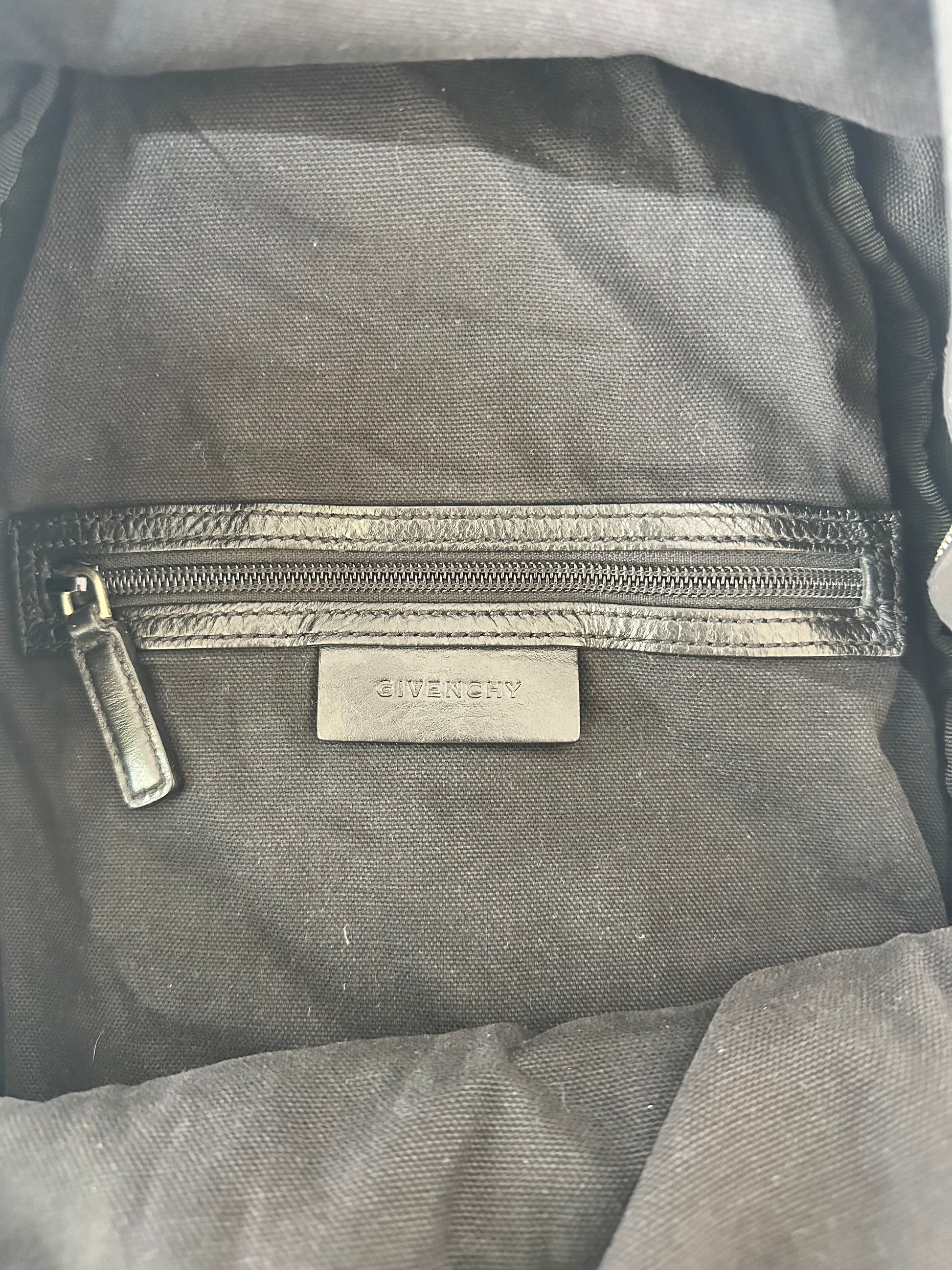 The GIVENCHY MADONNA PRINTED BACKPACK features a sleek black color and is made with premium leather and nylon material. Its hardware is crafted with silver accents, and there is one exterior zip pocket and one interior zip pocket for storage. The fabric interior lining provides a luxurious touch, while the backpack is conveniently carried with flat handles and a zip closure. Measuring at 27 x 38 x 8 cm, this backpack is made in Romania.