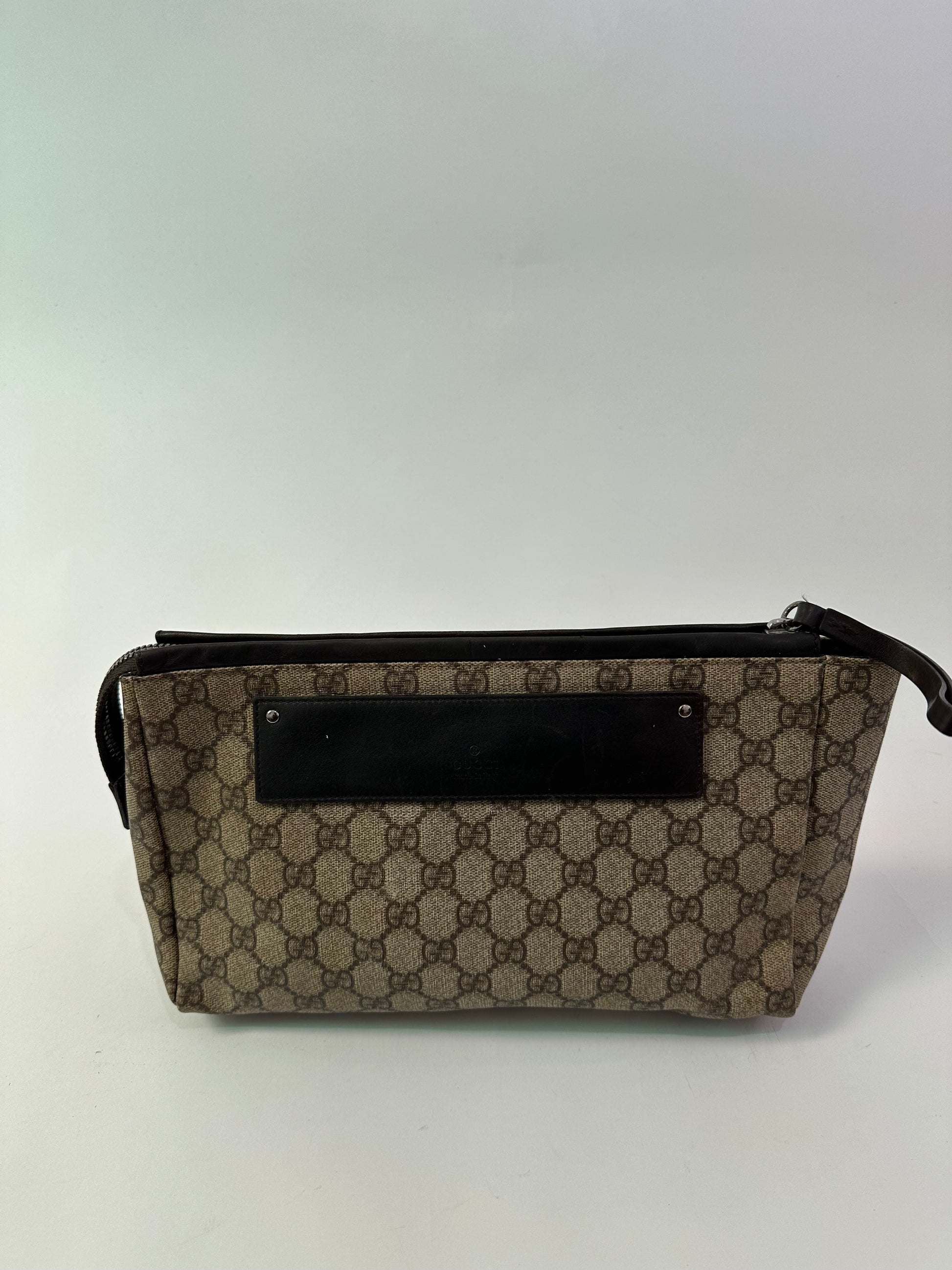 The Gucci Beige/Brown GG Coated Canvas Cosmetic Bag is perfect for travel or use everyday.