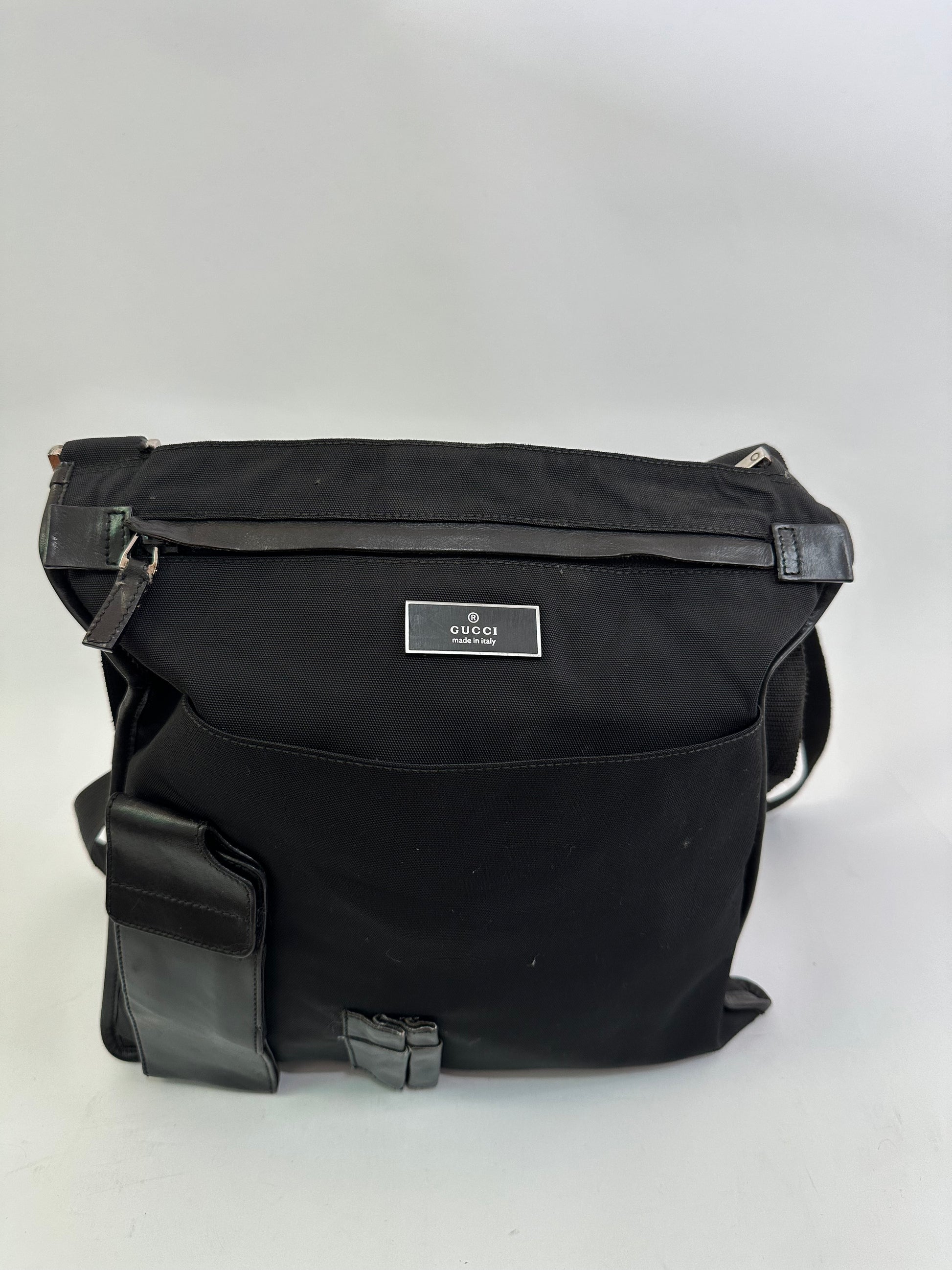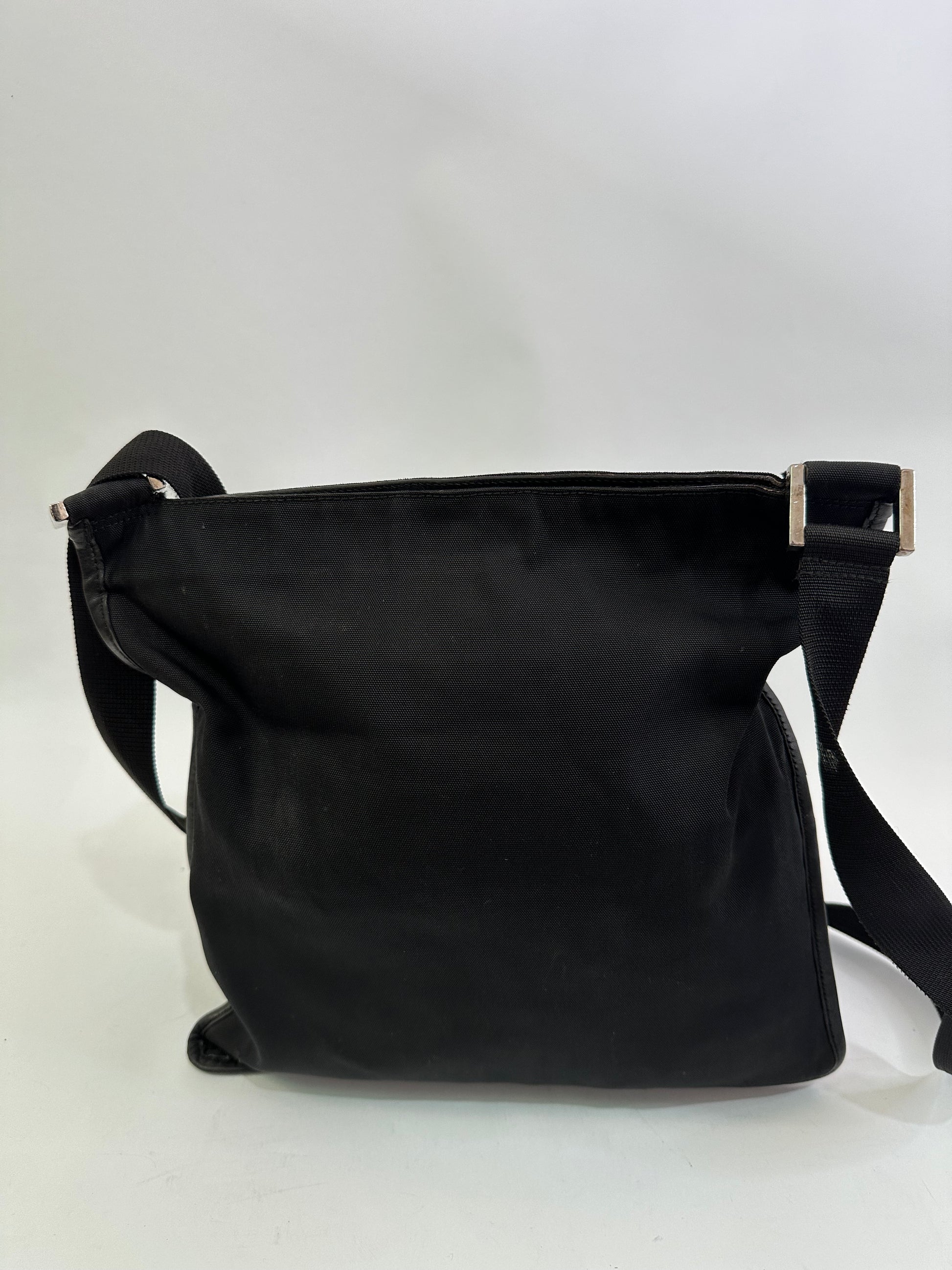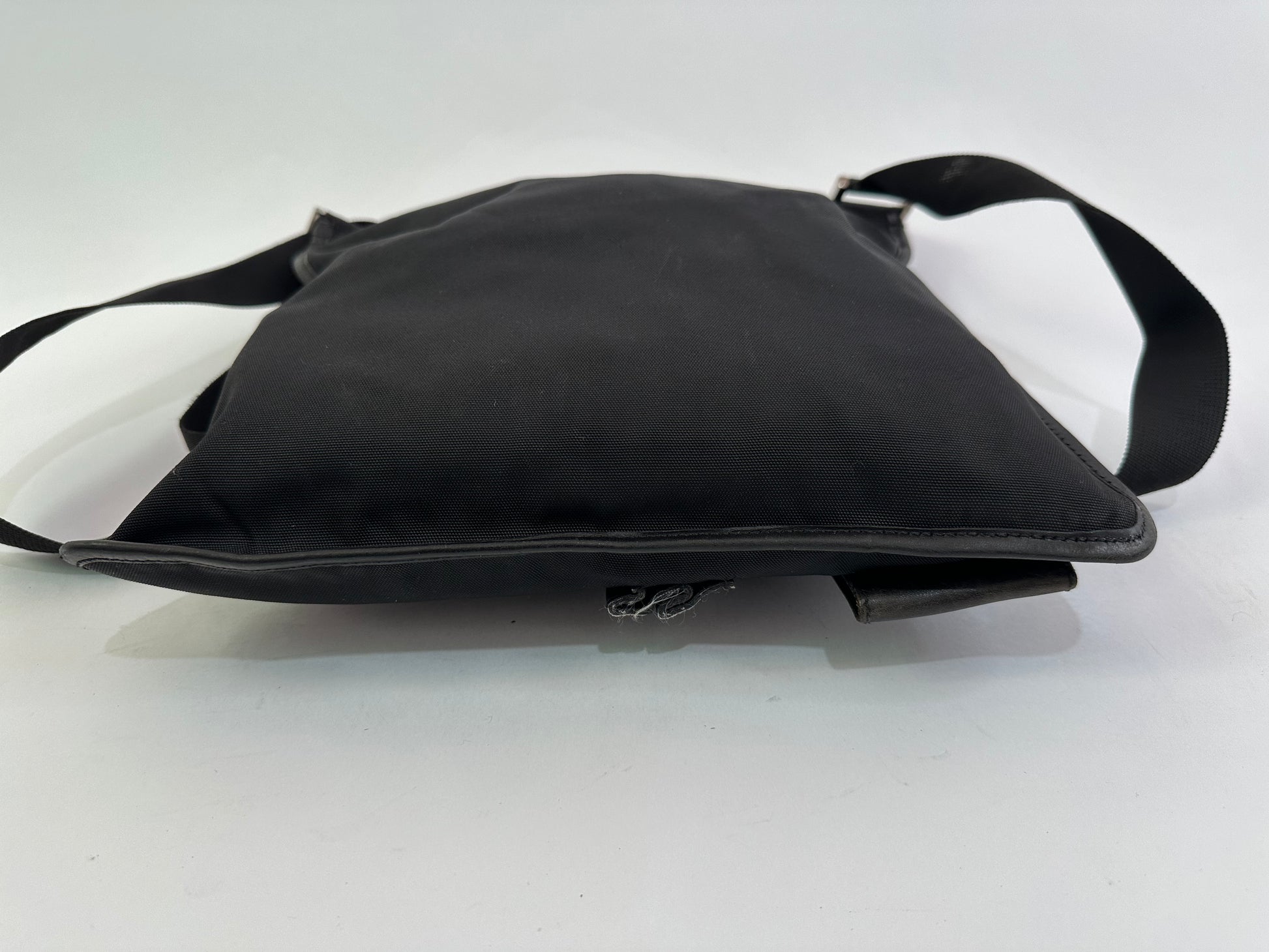 This crossbody bag features a nylon body with leather trim, front exterior zip and slip pockets, a flat leather strap, and an open top.