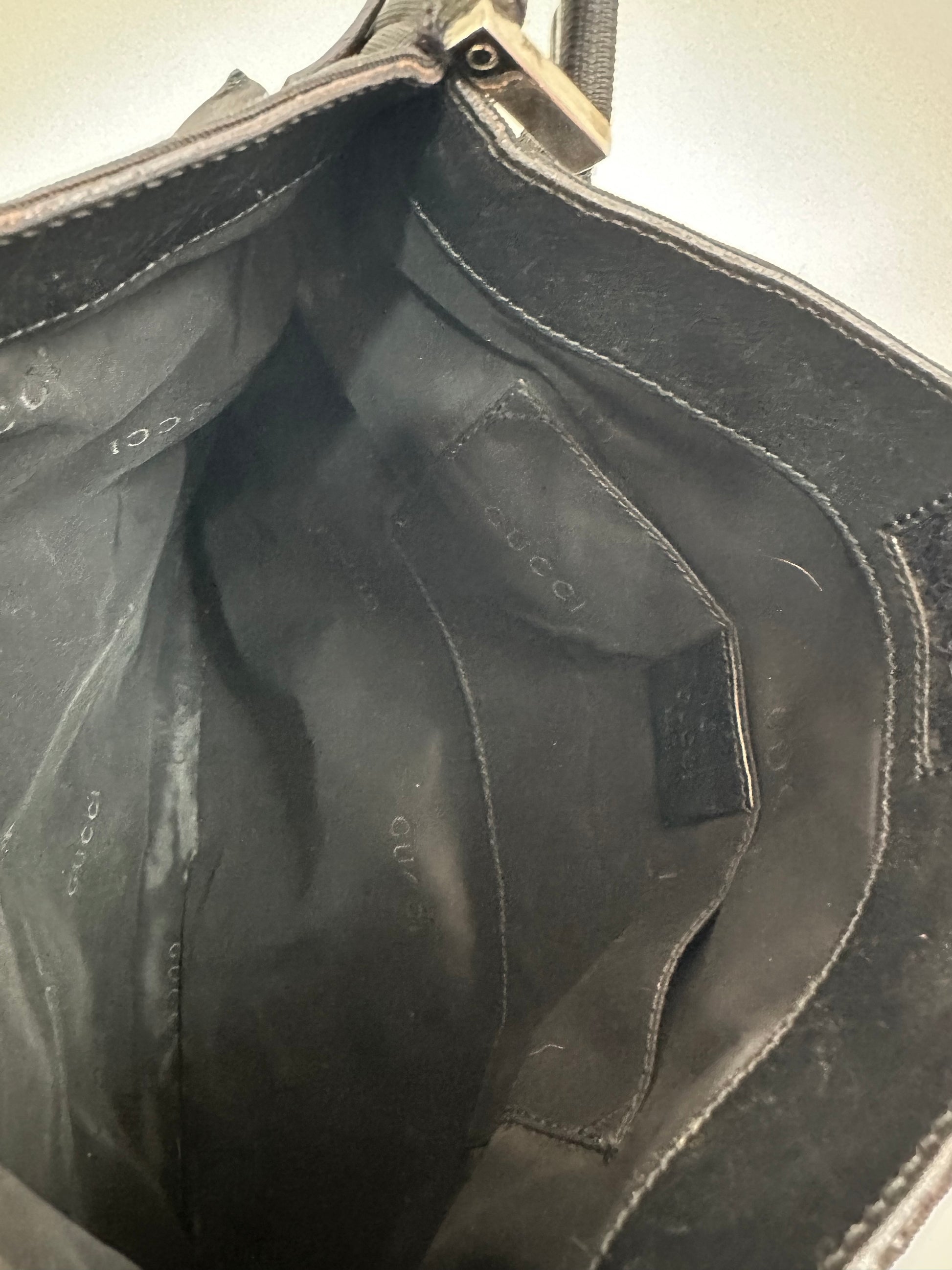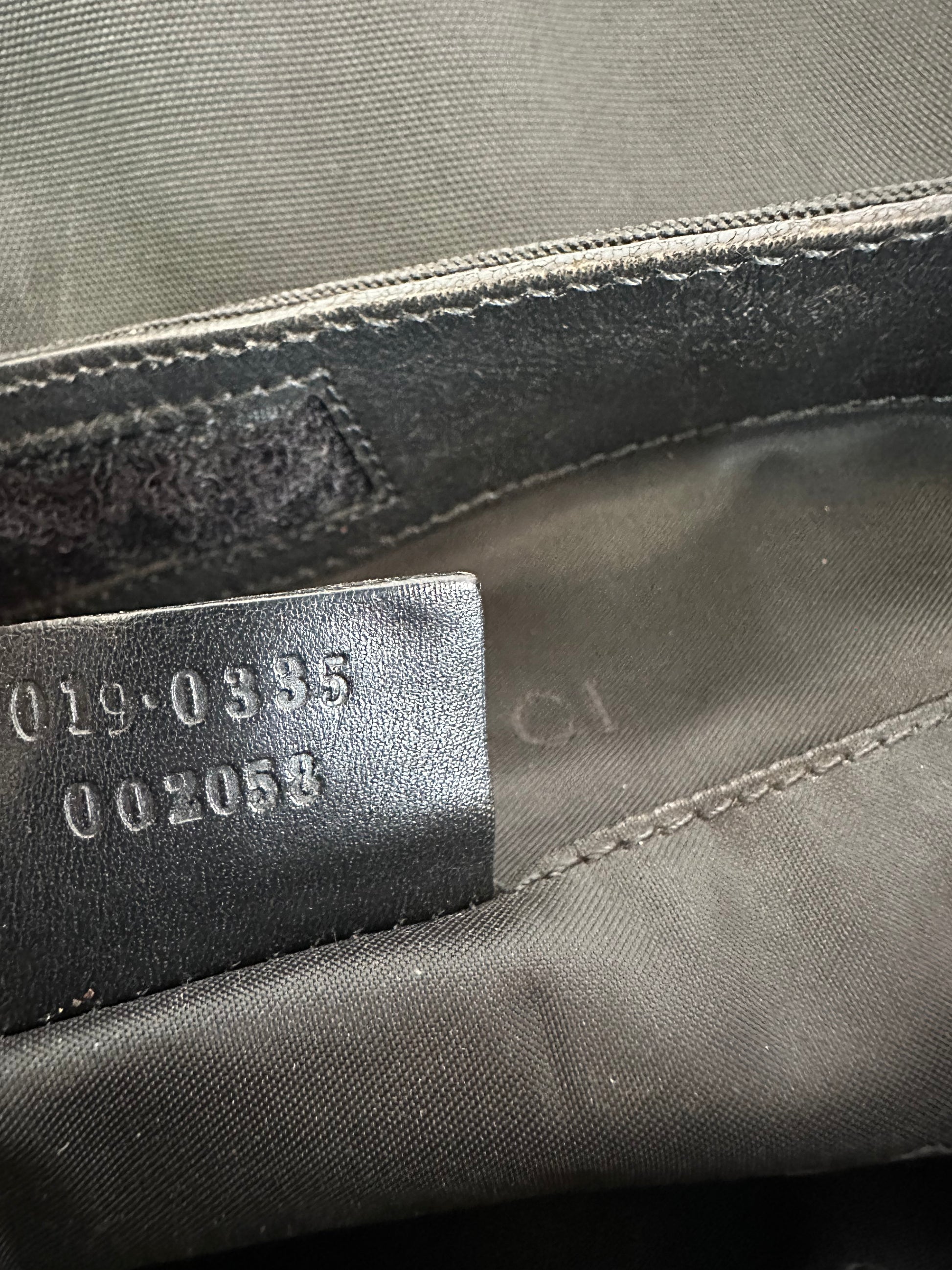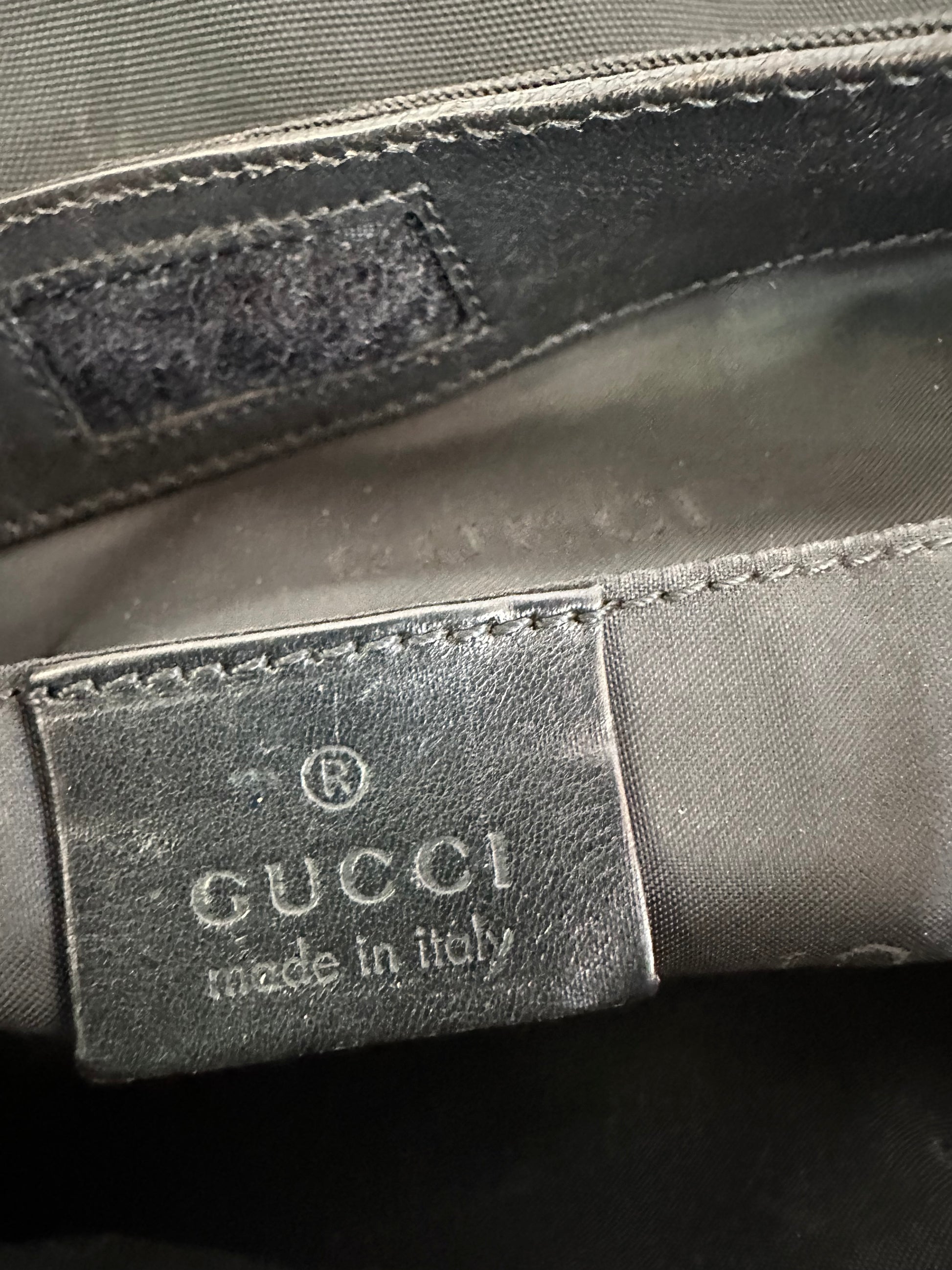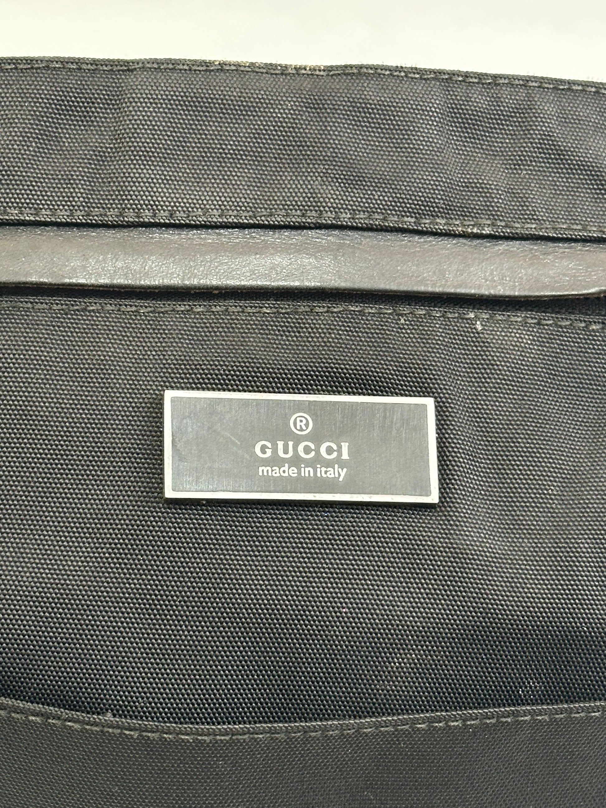 This crossbody bag features a nylon body with leather trim, front exterior zip and slip pockets, a flat leather strap, and an open top.