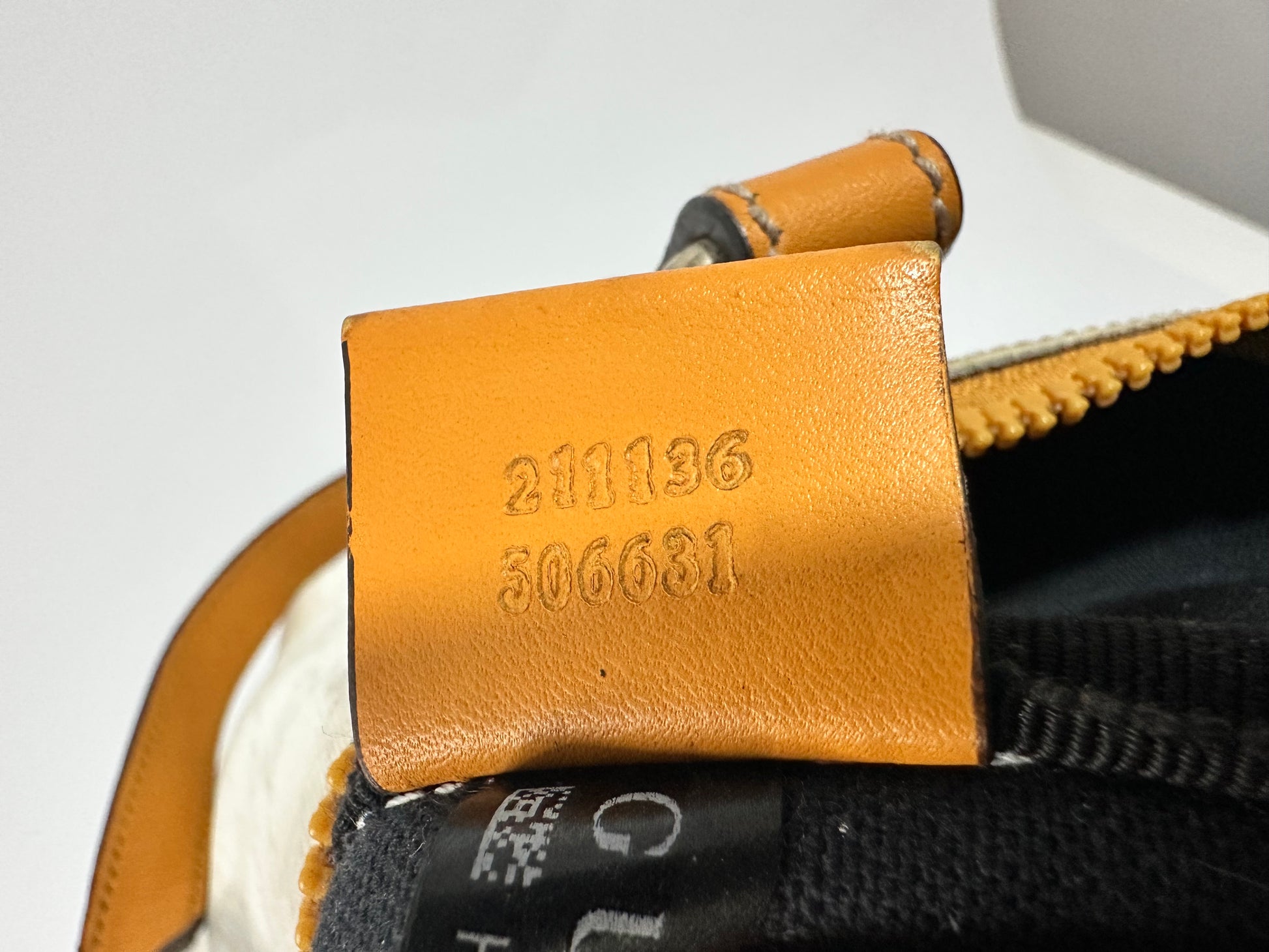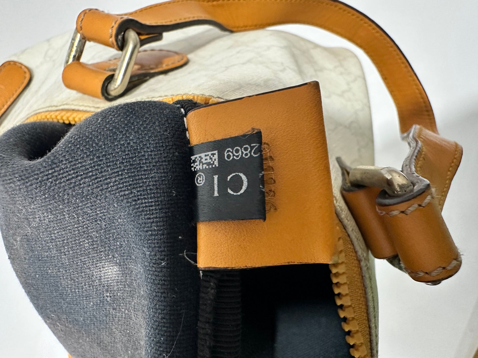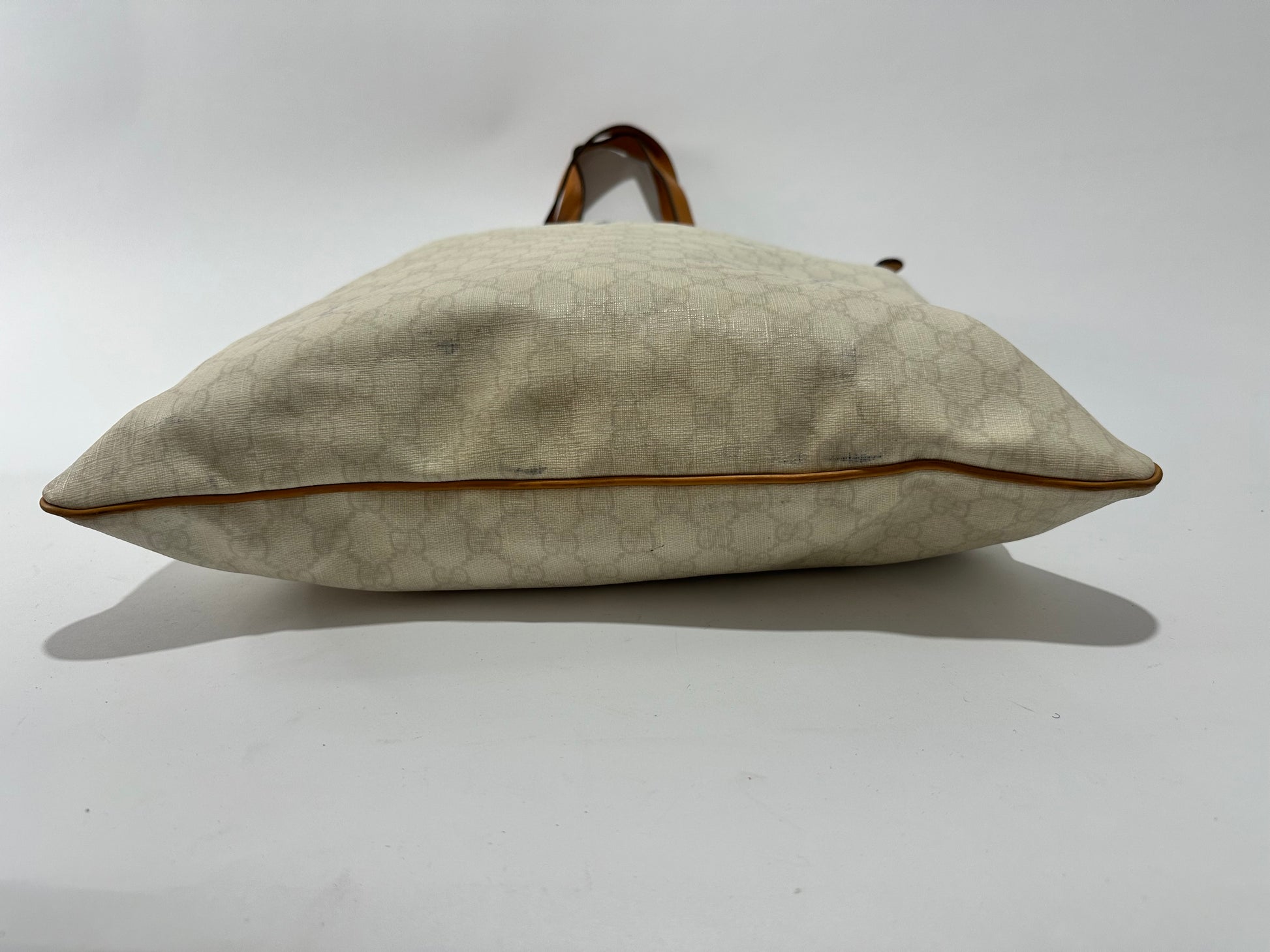This is an authentic GUCCI GG Plus Monogram Flat Tote in Yellow. This chic tote is finely crafted of white Gucci GG monogram coated canvas. This handbag features tall thin mustard colored leather top handles and trim with polished light brass hardware. The top is open to a black fabric interior.
