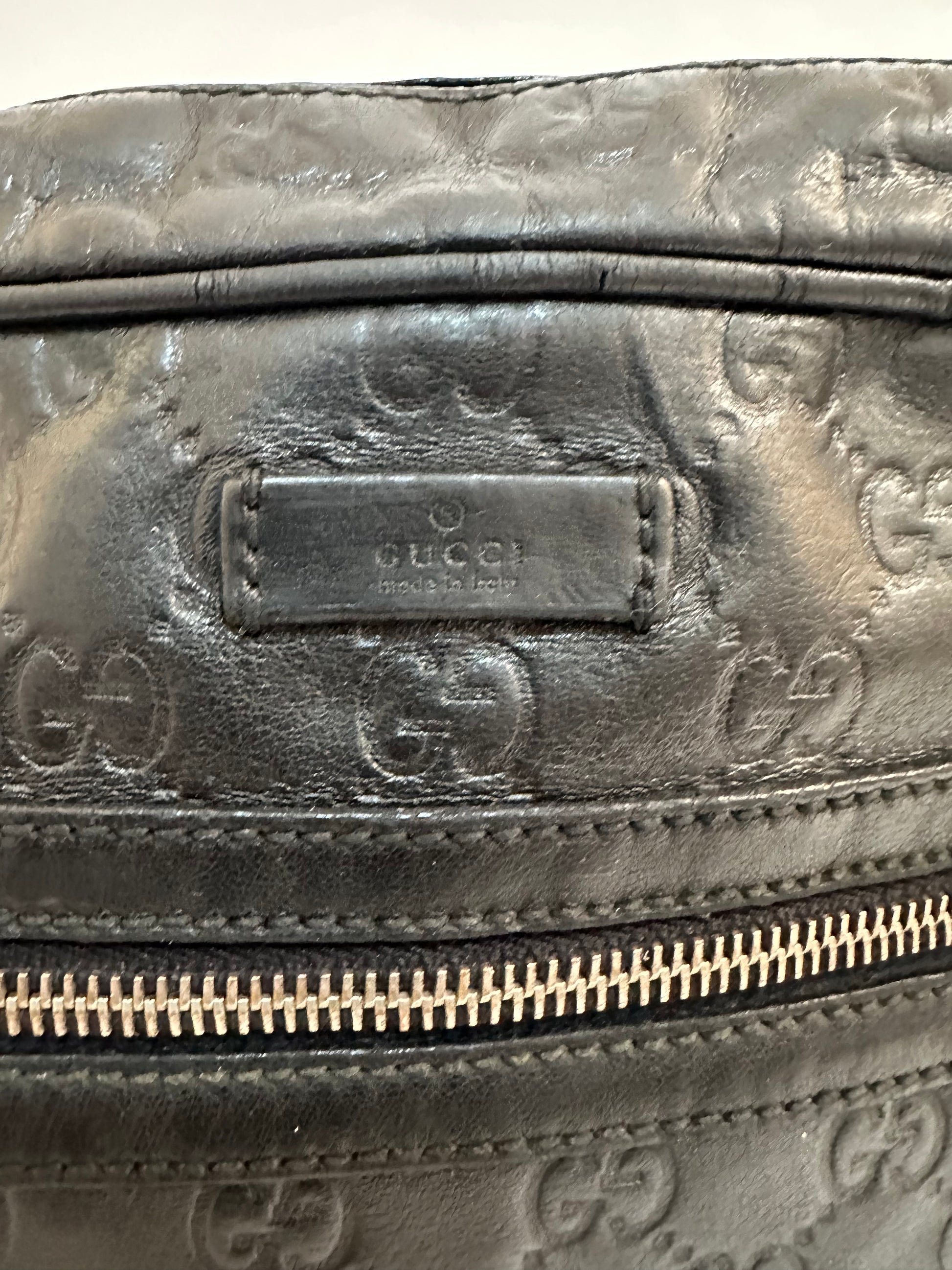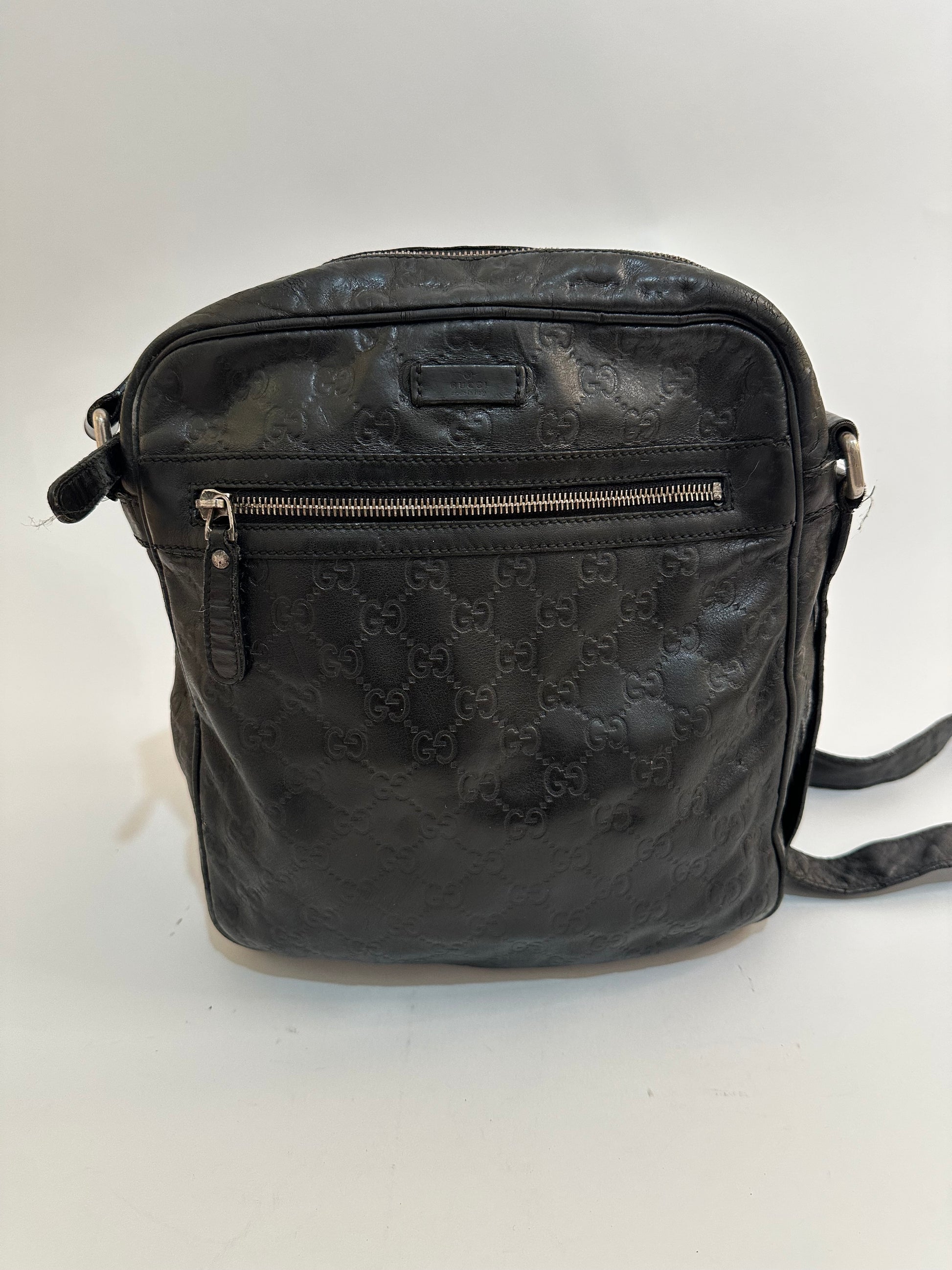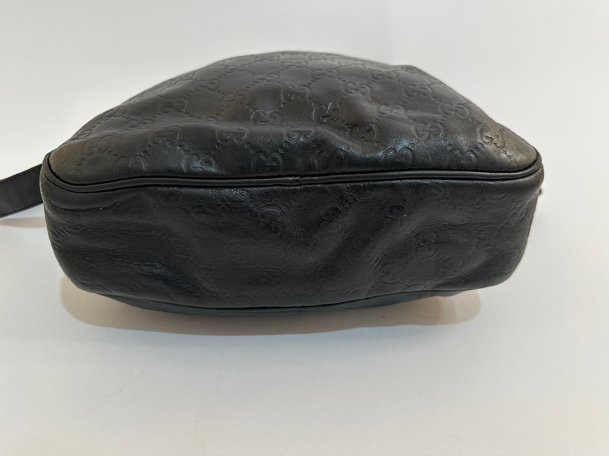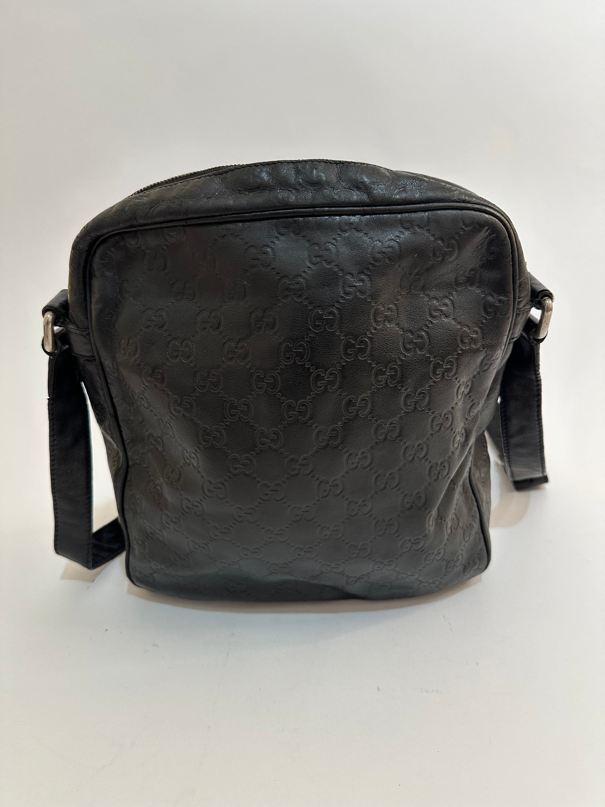This is an authentic GUCCI Guccissima Flat Messenger Bag in Black. This stylish bag is crafted of smooth Gucci GG monogram embossed Guccissima leather in brown. This bag features a black adjustable body strap and light gold hardware. The top zipper opens to a brown fabric interior with zipper and patch pockets.