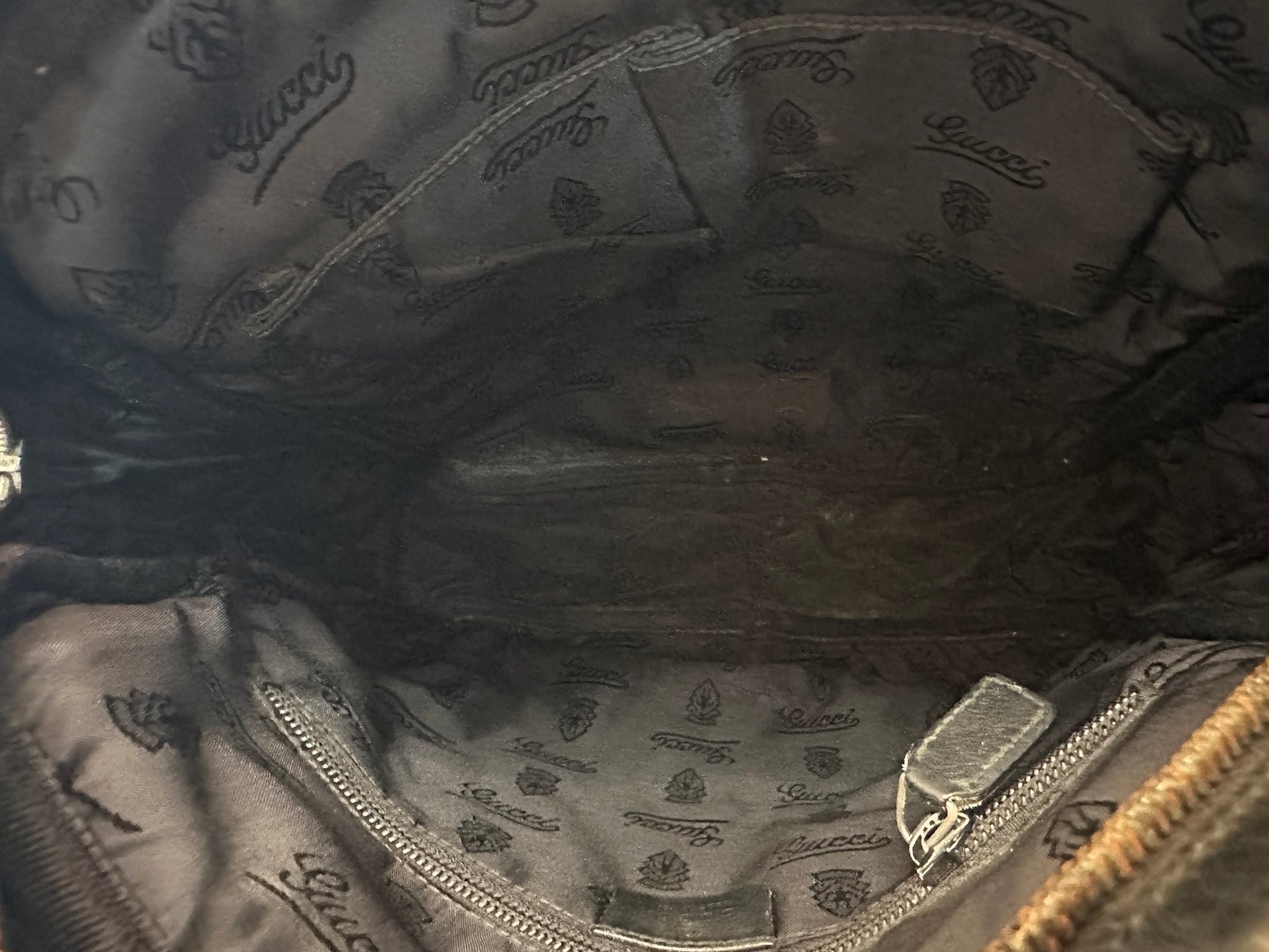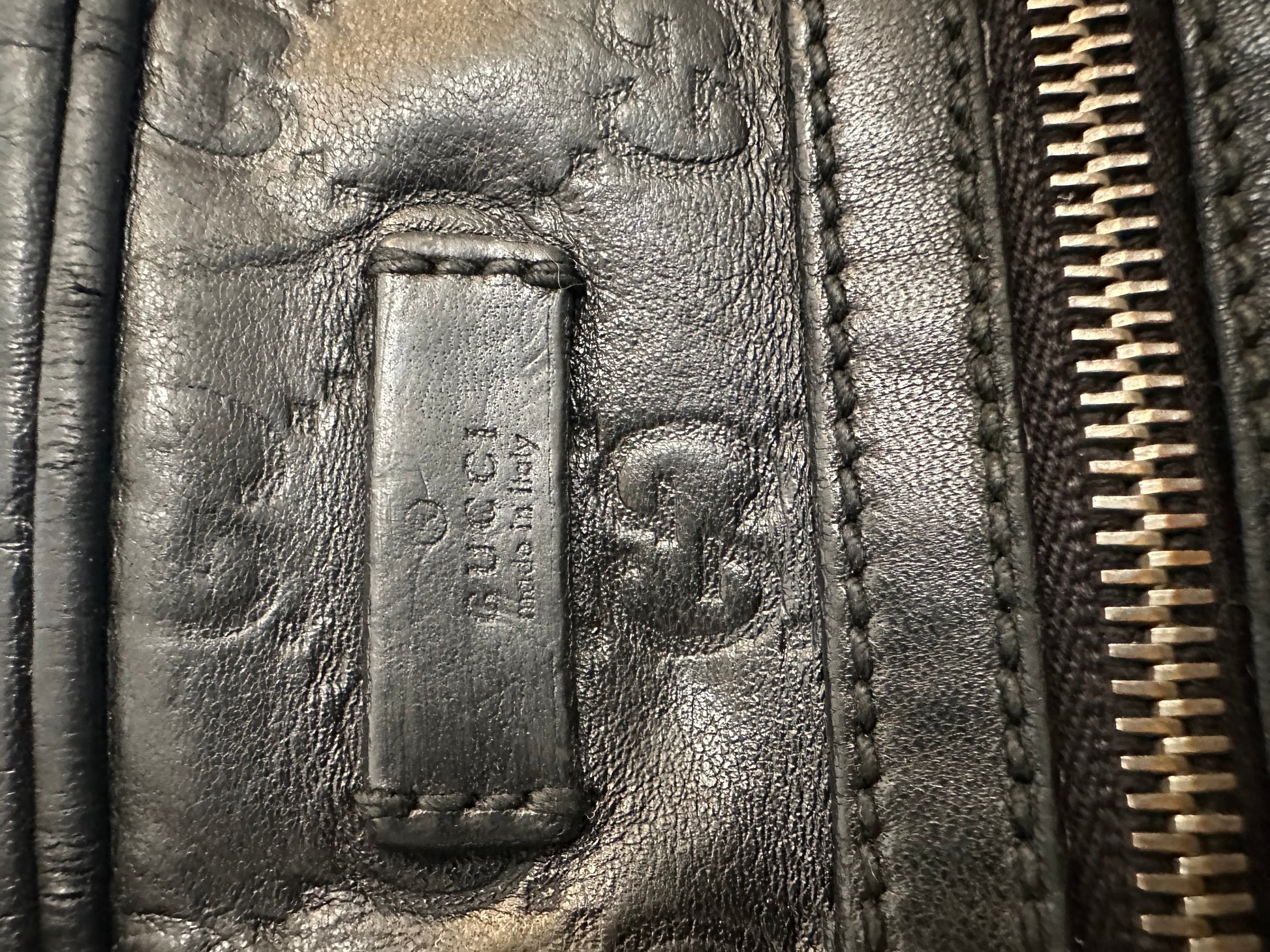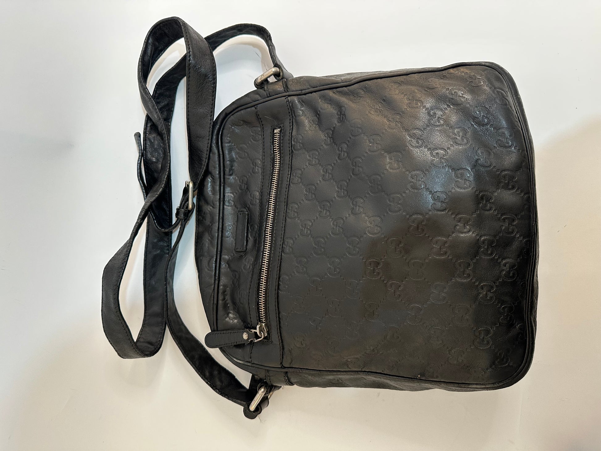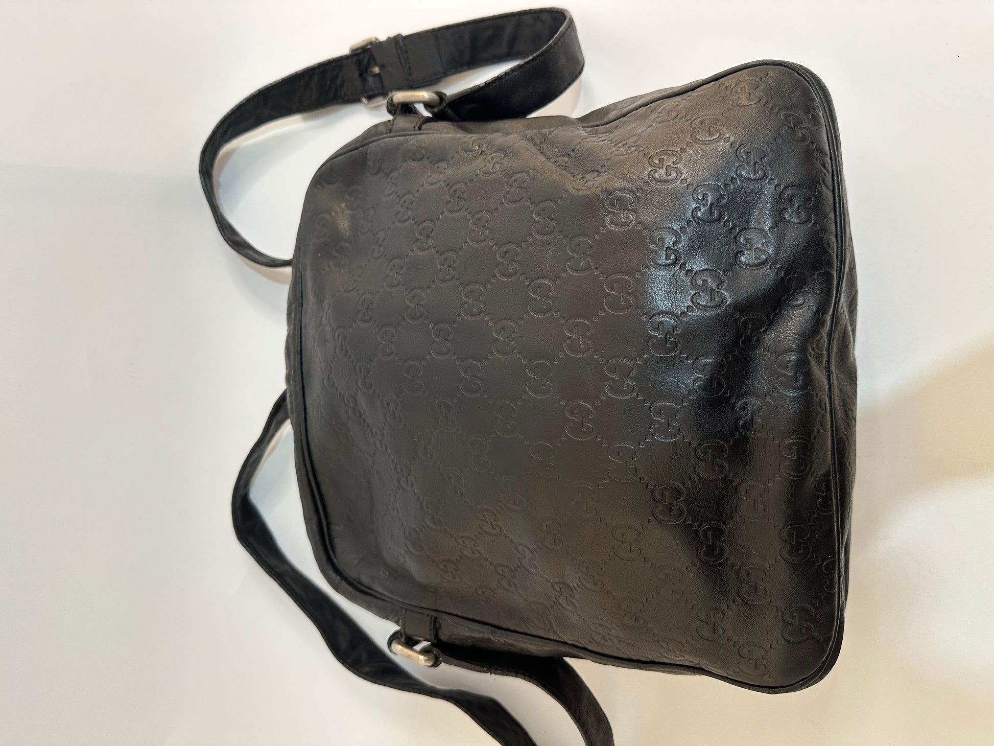 This is an authentic GUCCI Guccissima Flat Messenger Bag in Black. This stylish bag is crafted of smooth Gucci GG monogram embossed Guccissima leather in brown. This bag features a black adjustable body strap and light gold hardware. The top zipper opens to a brown fabric interior with zipper and patch pockets.