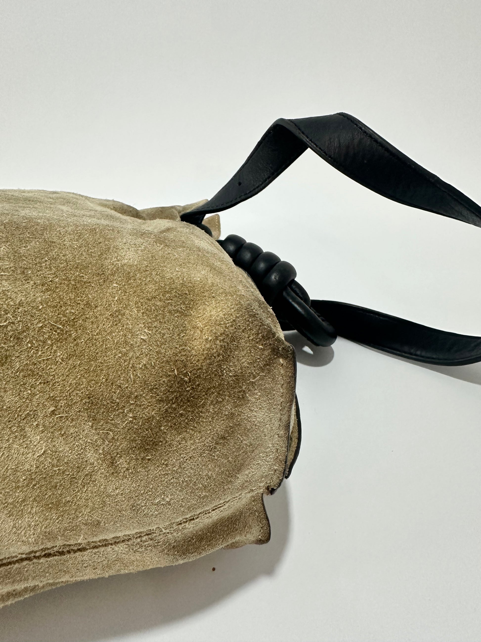 The Loewe Messenger Bag, designed by JW Anderson, features a neutral suede exterior, accented with gold-tone hardware and leather trim. Its single adjustable shoulder strap adds comfort and convenience, complemented by the leather trim embellishment. The interior is lined with leather and includes dual pockets, while the top features a snap closure for secure storage.