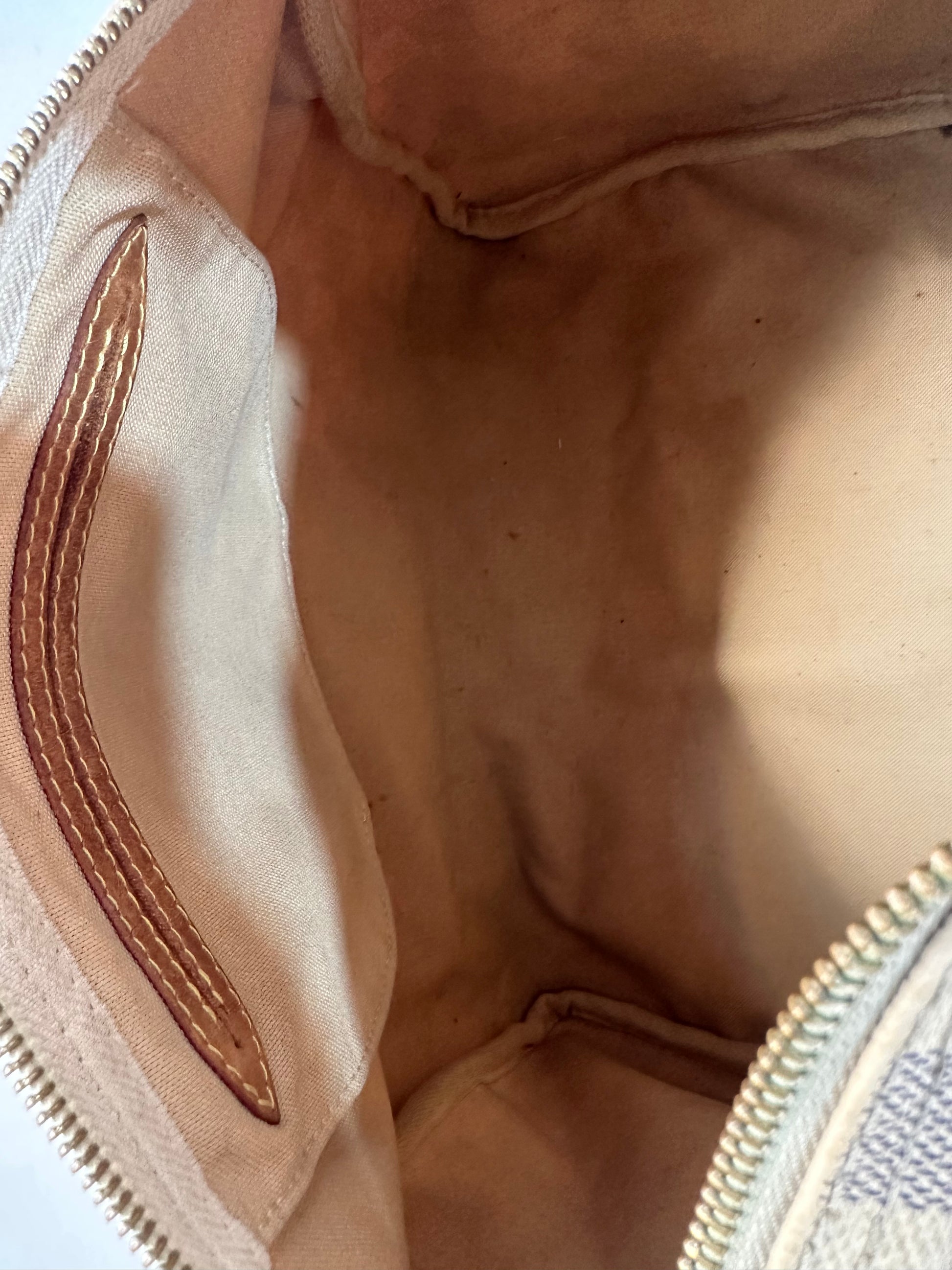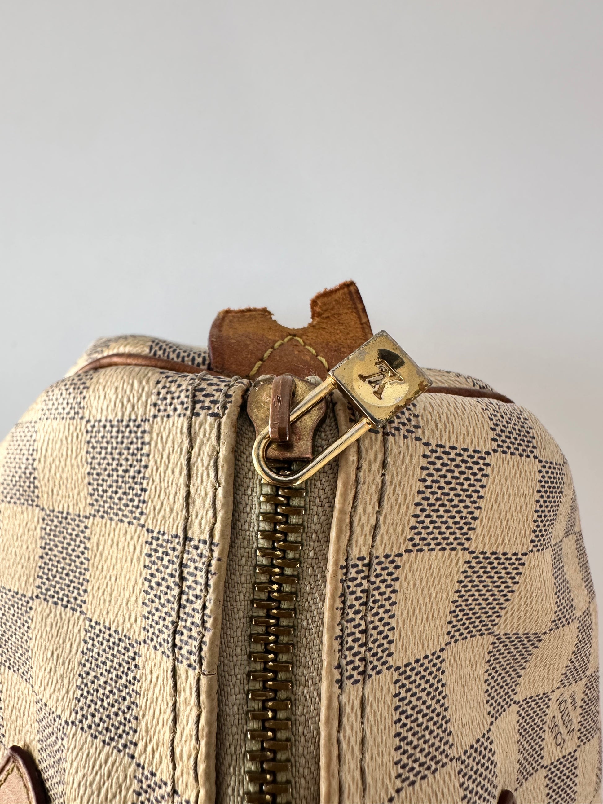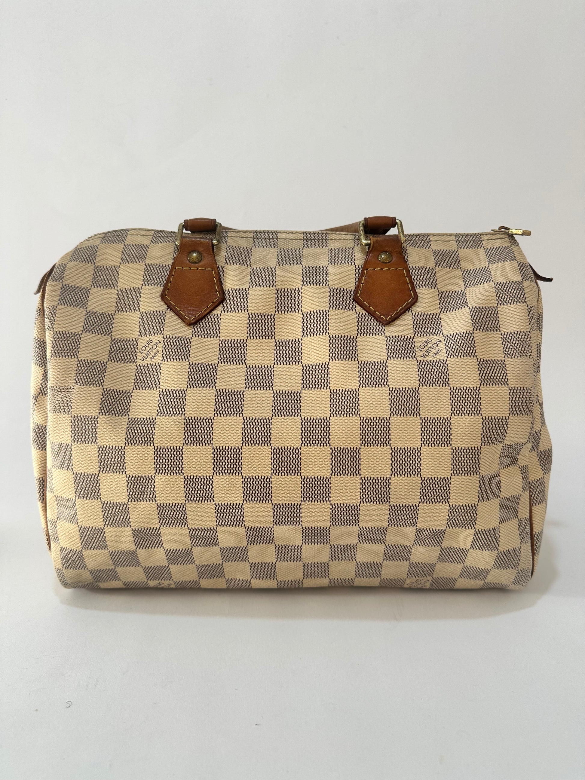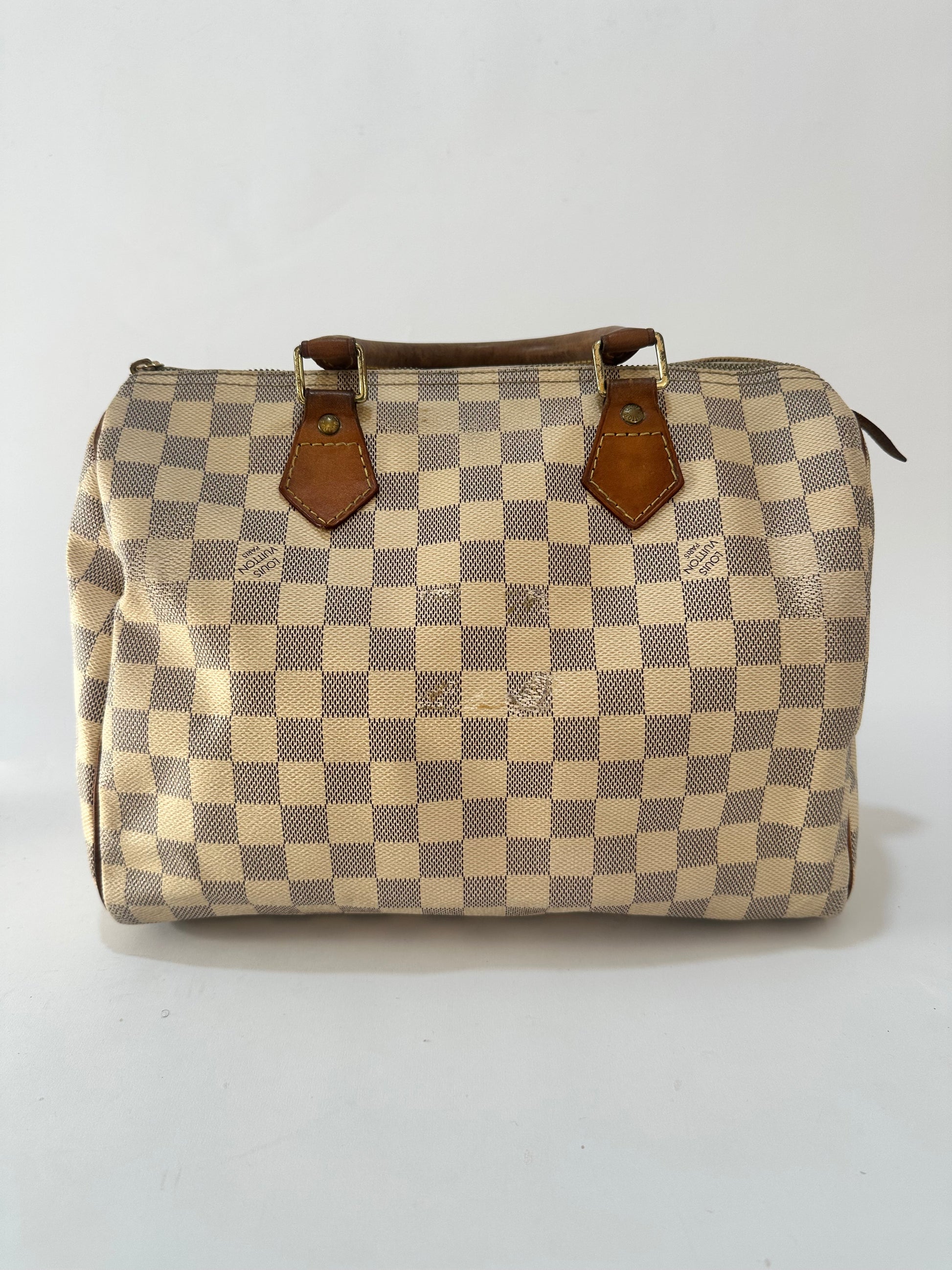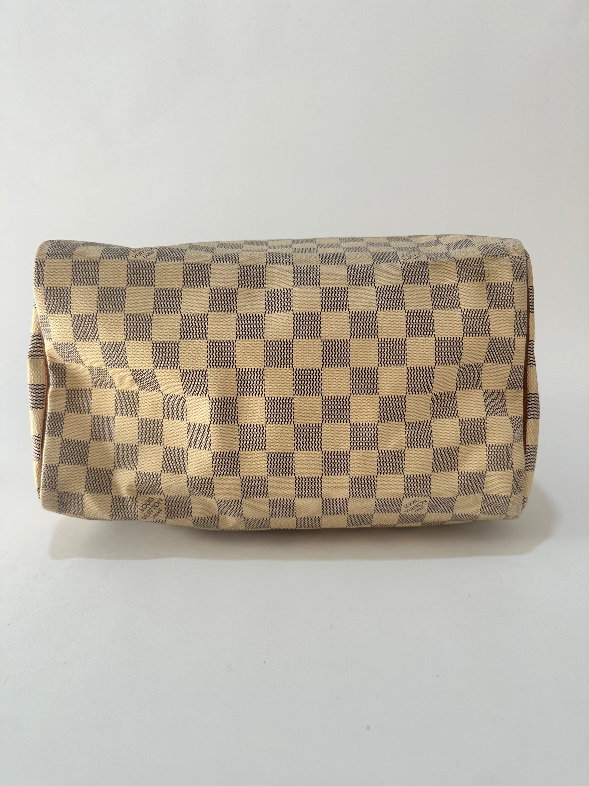 This is an authentic LOUIS VUITTON Damier Ebene Speedy 30. This stylish handbag is finely crafted of signature Louis Vuitton Damier patterned canvas in brown. The handbag features brown rolled leather top handles and trim with polished brass hardware. The top zipper opens to a red fabric interior with a zipper pocket.