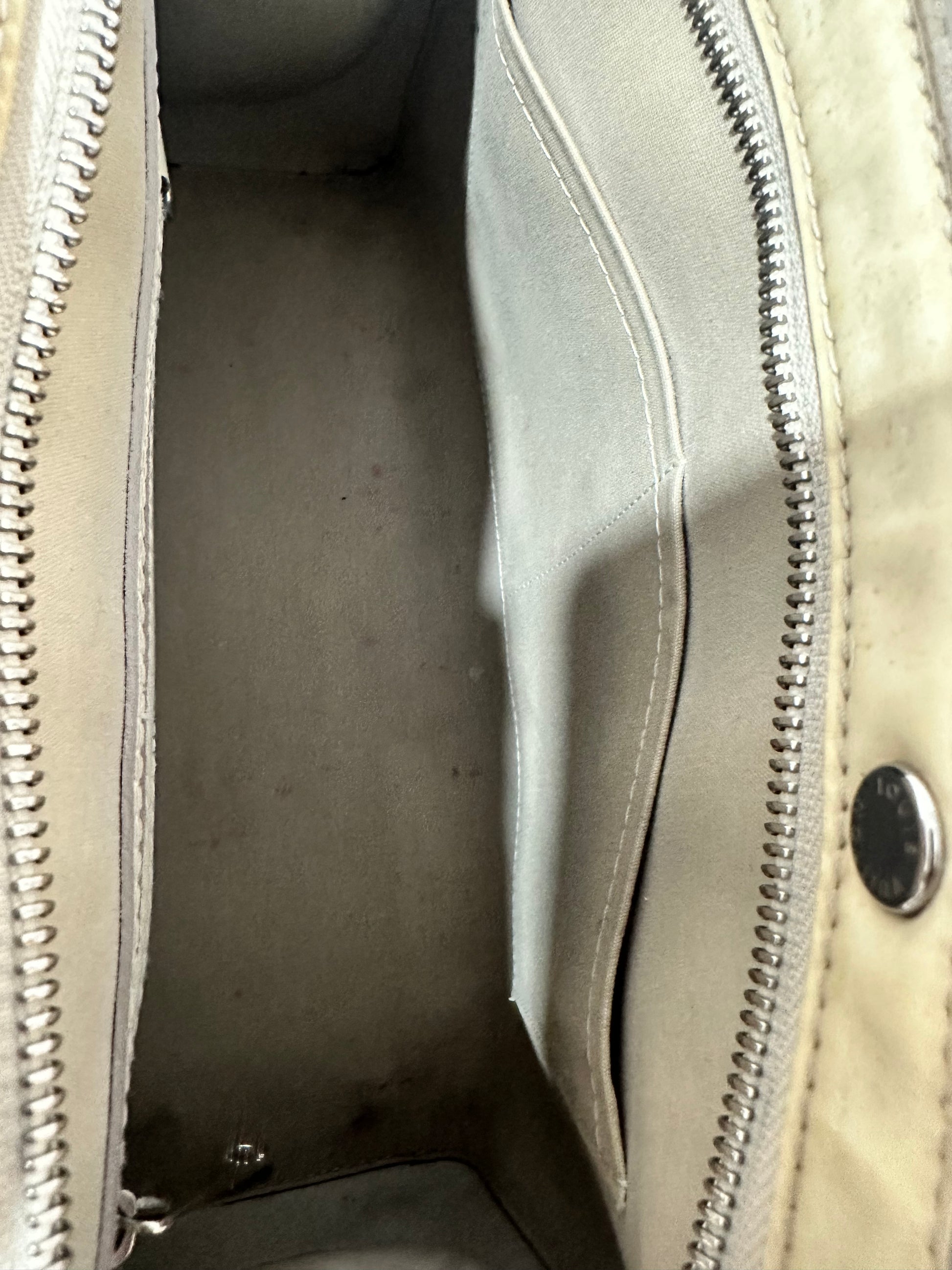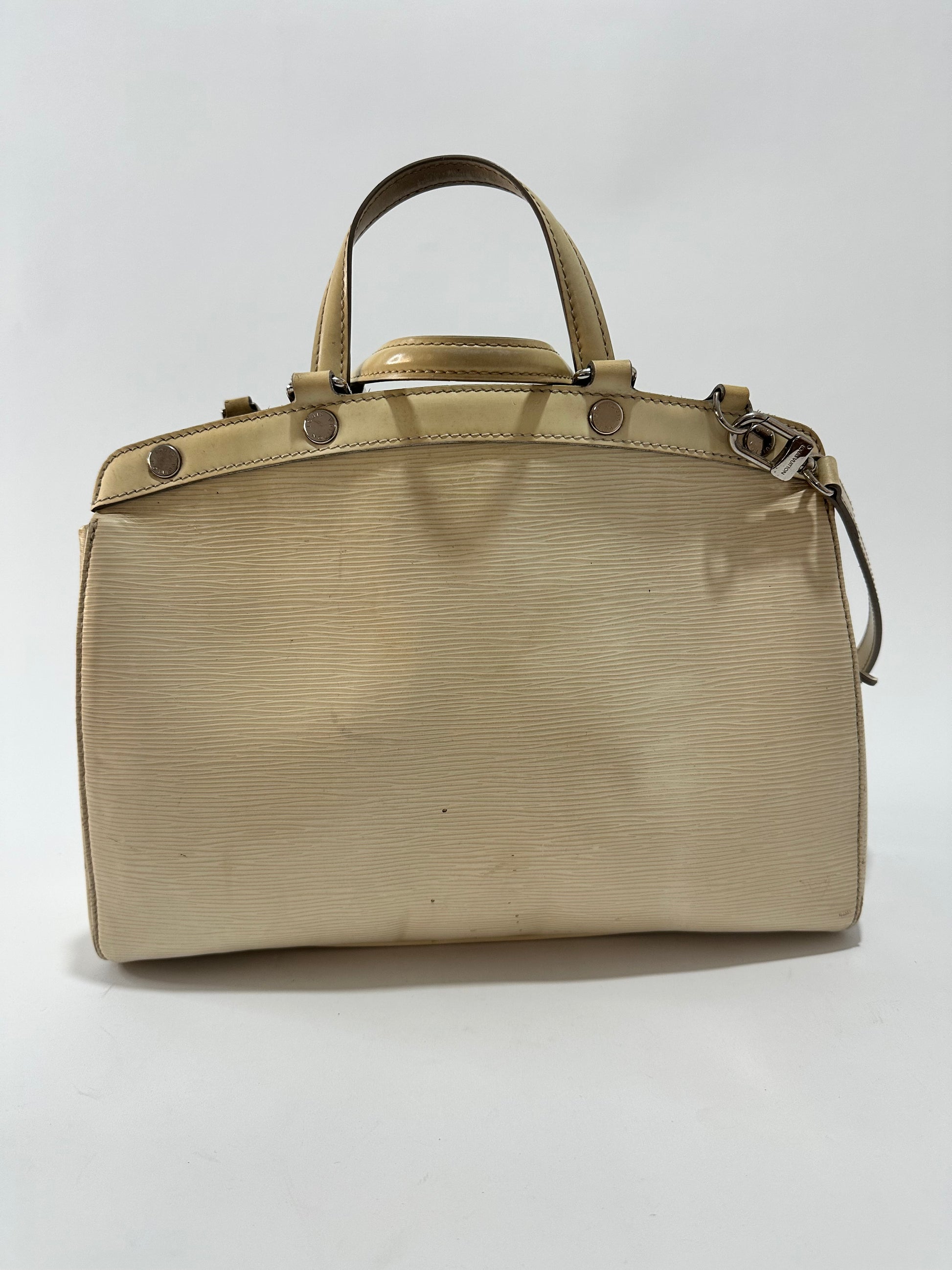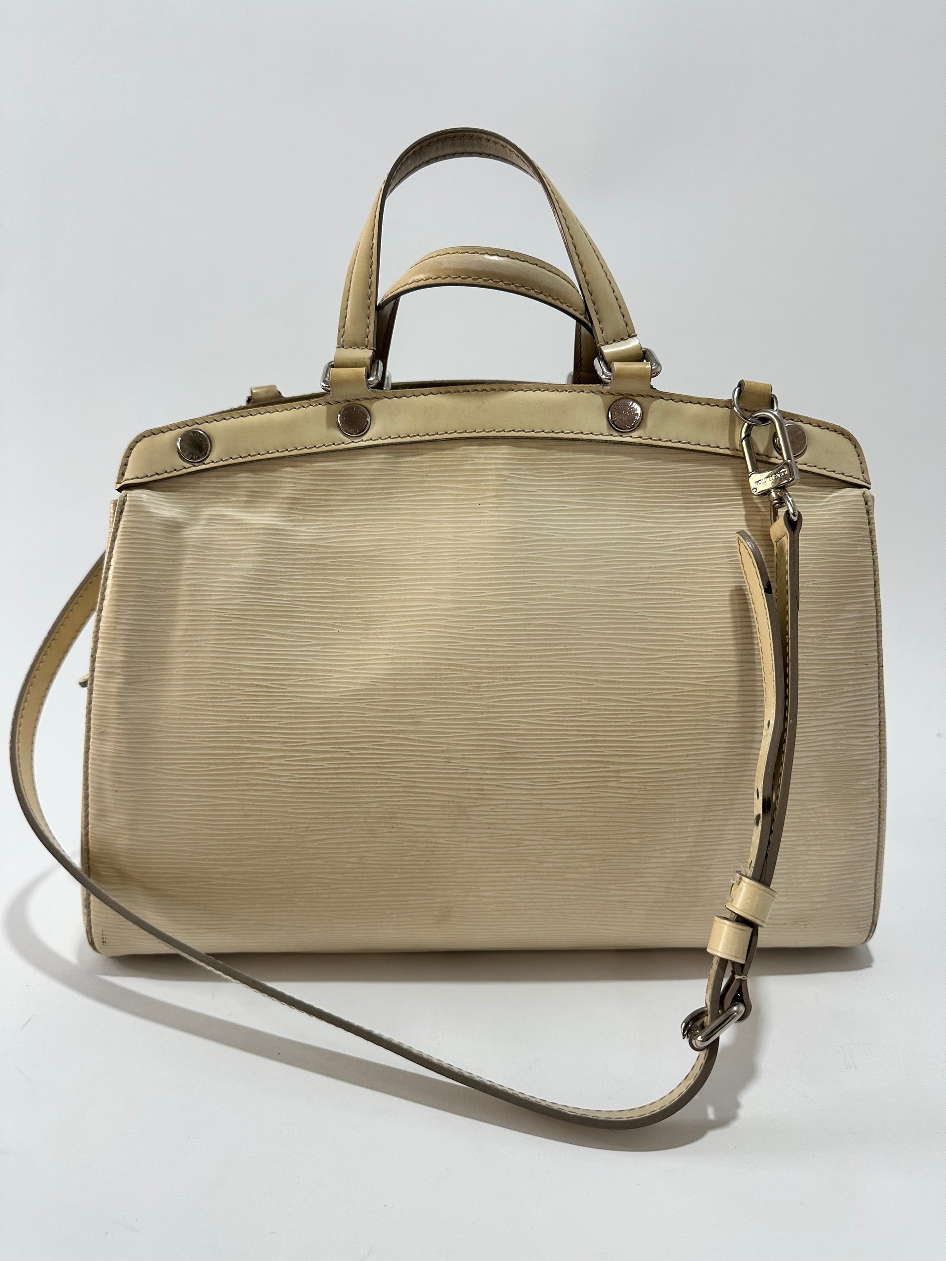 This is an authentic LOUIS VUITTON Epi Brea MM in Ivory. This stylish tote is crafted of Louis Vuitton signature textured epi leather in ivory. The bag features smooth leather top handles with silver links, a removable, adjustable shoulder strap, and a smooth leather top crest with silver rivets. The overextended top zipper opens to a beige fabric interior with zipper and patch pockets.