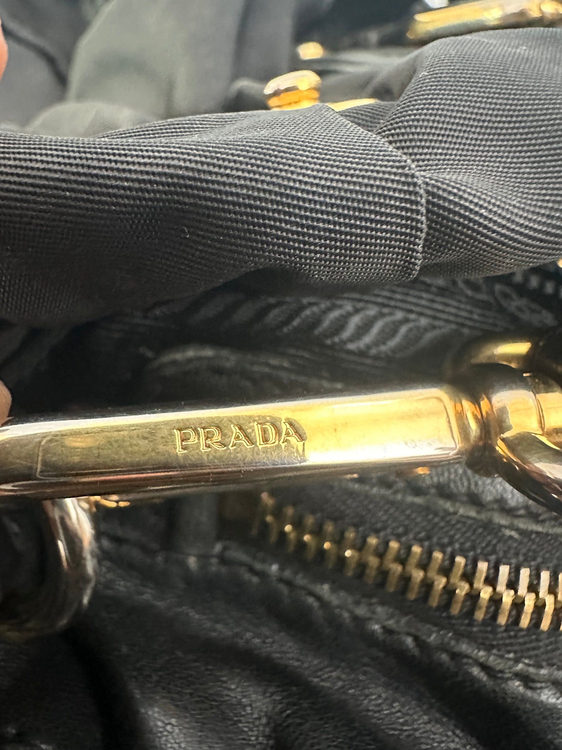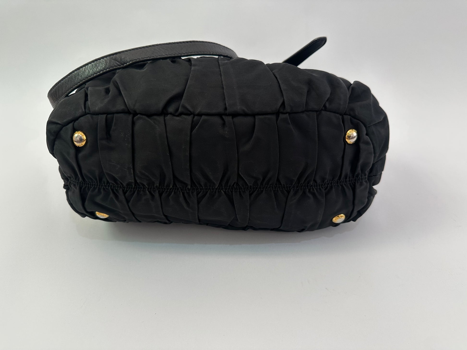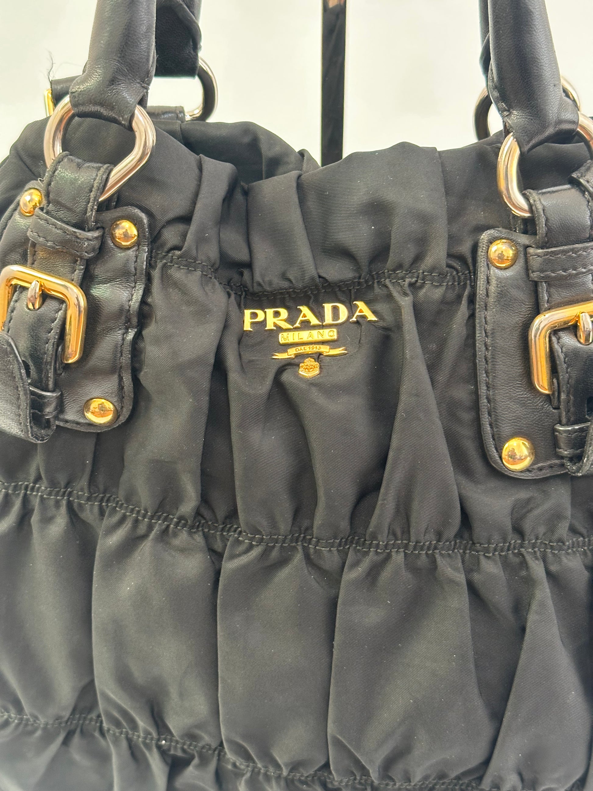 Feminine in shape and grand on design, this tote bag by Prada will be a loved addition to your closet. It has been crafted from Gaufre style nylon and styled minimally with gold-tone hardware. It comes with two top handles, zip closure and a perfectly-sized main compartment lined with nylon. The black-hued bag is complete with protective metal feet and the brand logo on the front
