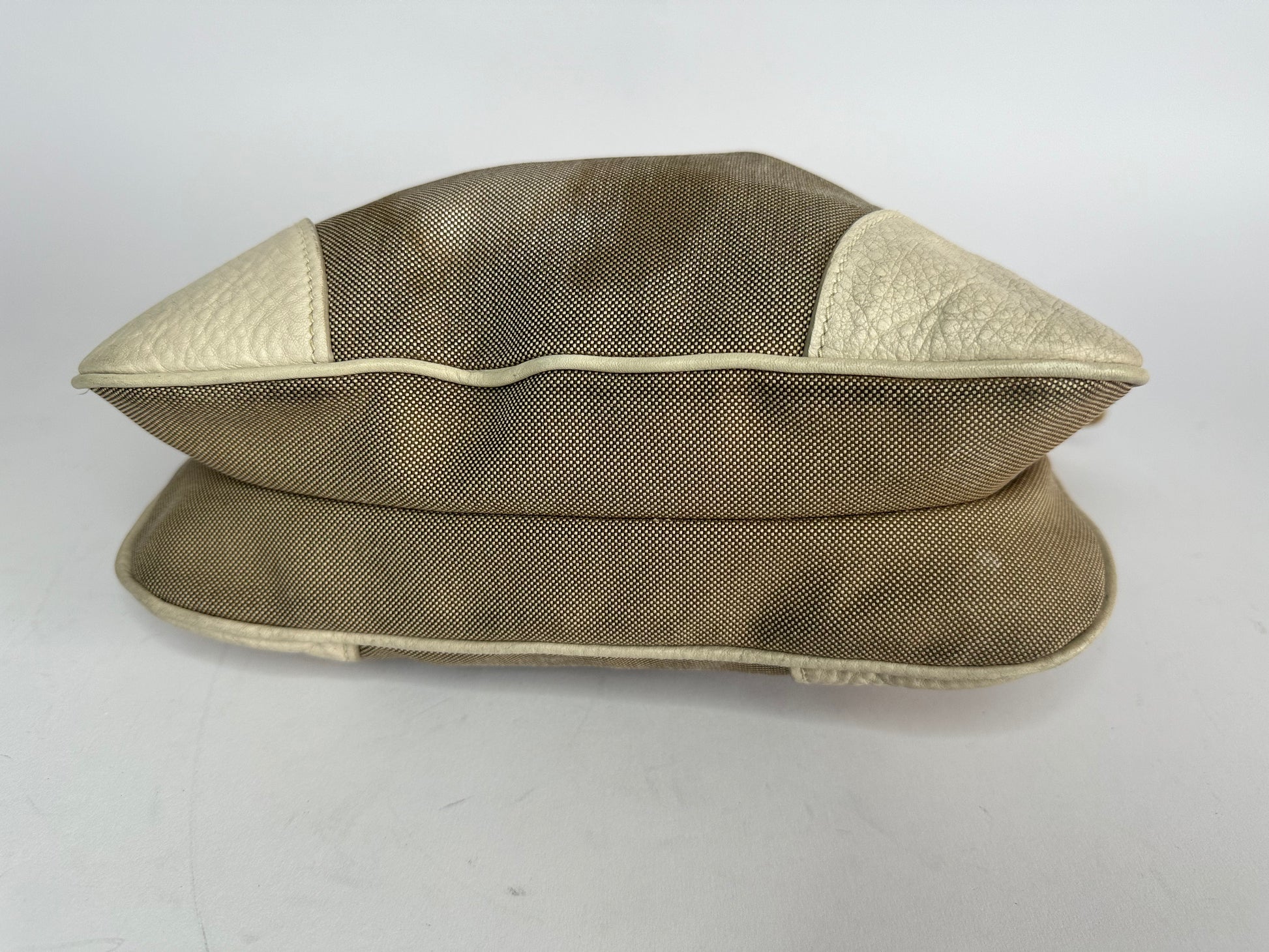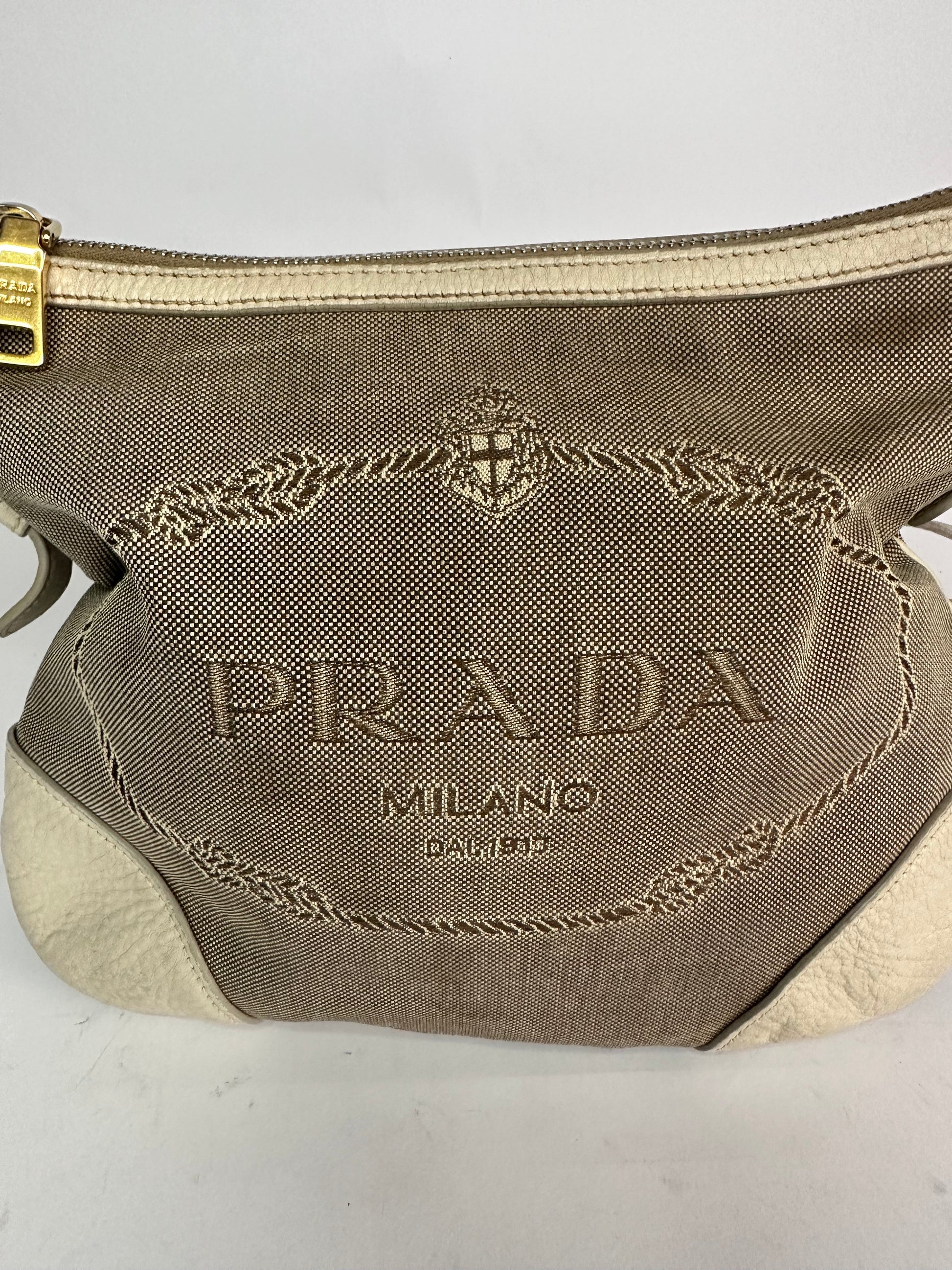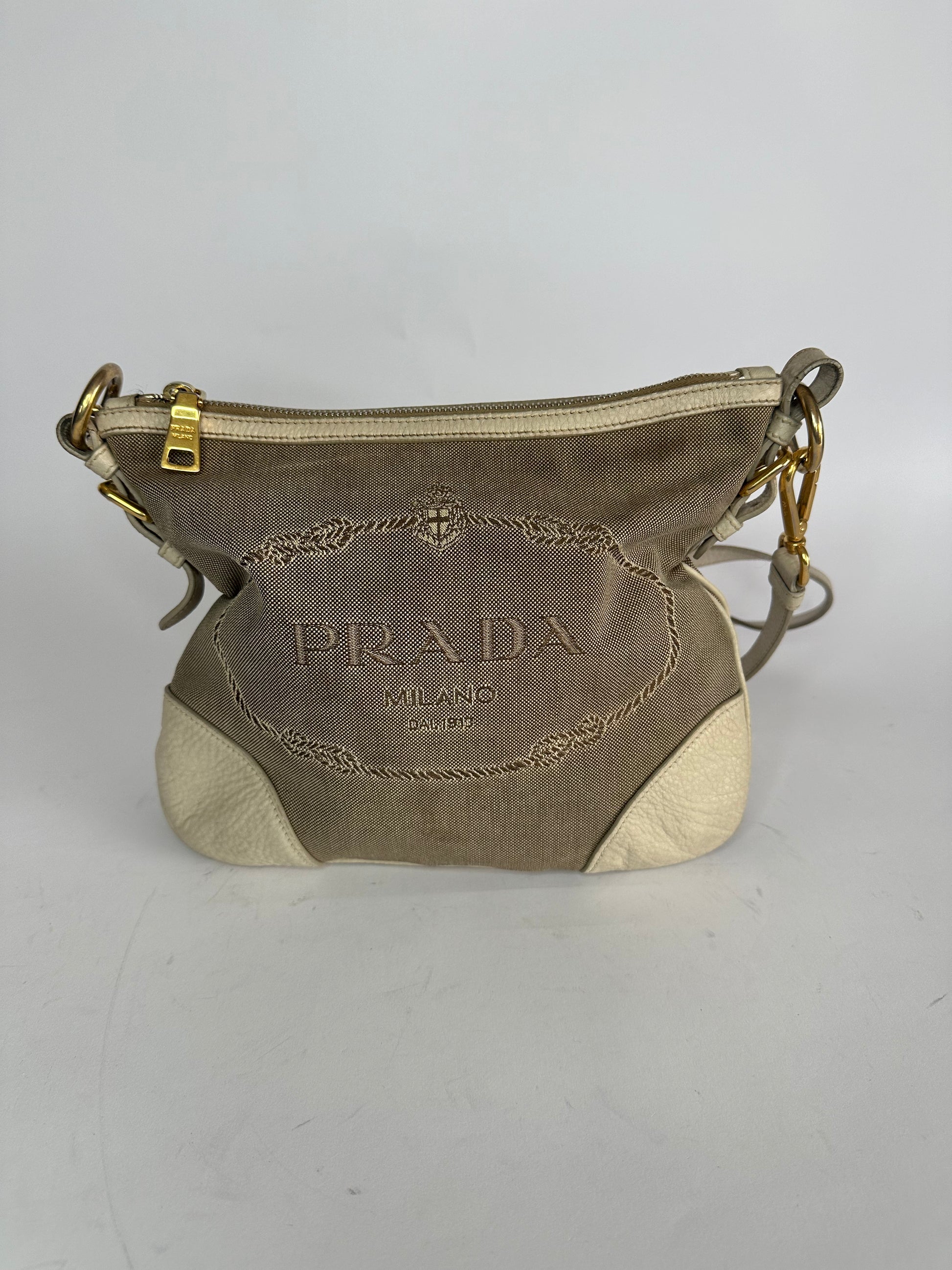 This is an authentic PRADA Jacquard Logo Small Flat Messenger Bag in White. The compact fabric messenger bag features beige canvas and white leather material with gold hardware. This bag features an adjustable white leather crossbody strap and a small removable luggage tag. The top zipper opens to a beige Prada jacquard fabric interior with a both a zipper and patch pocket.