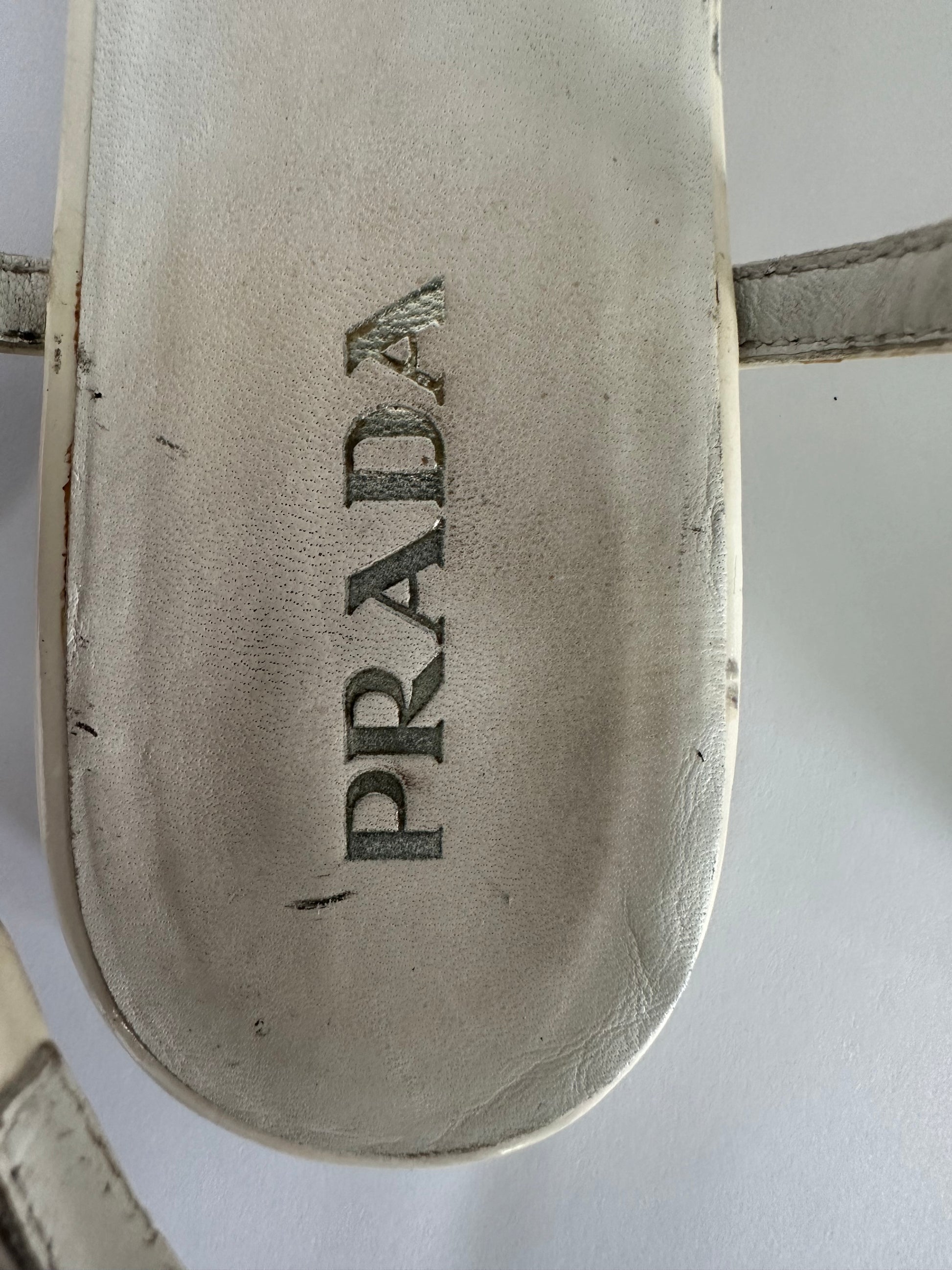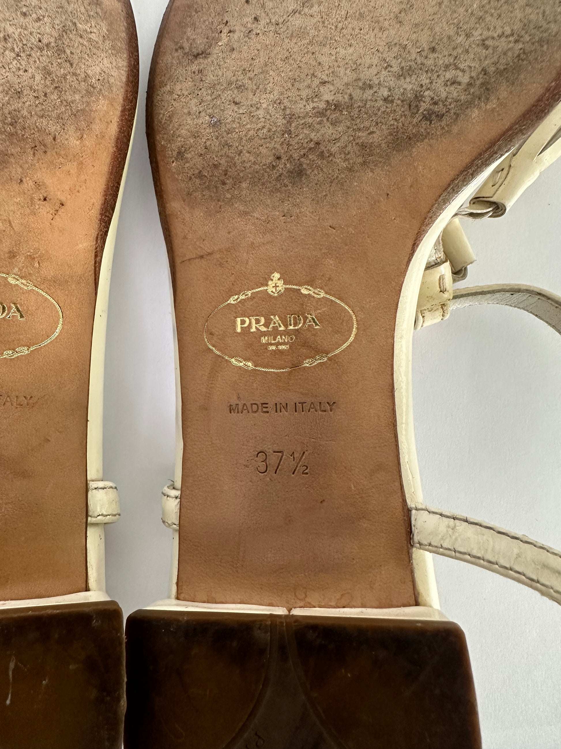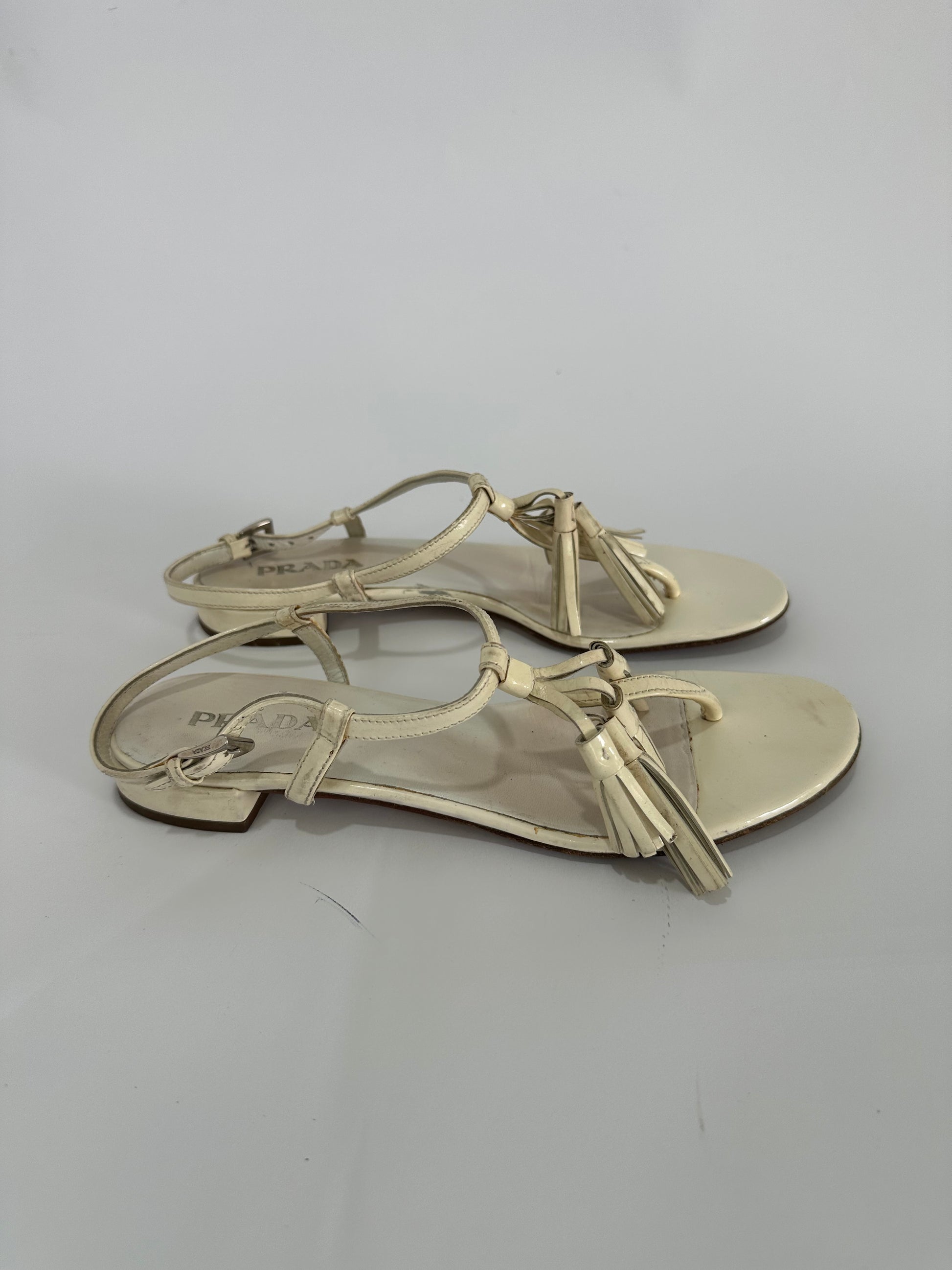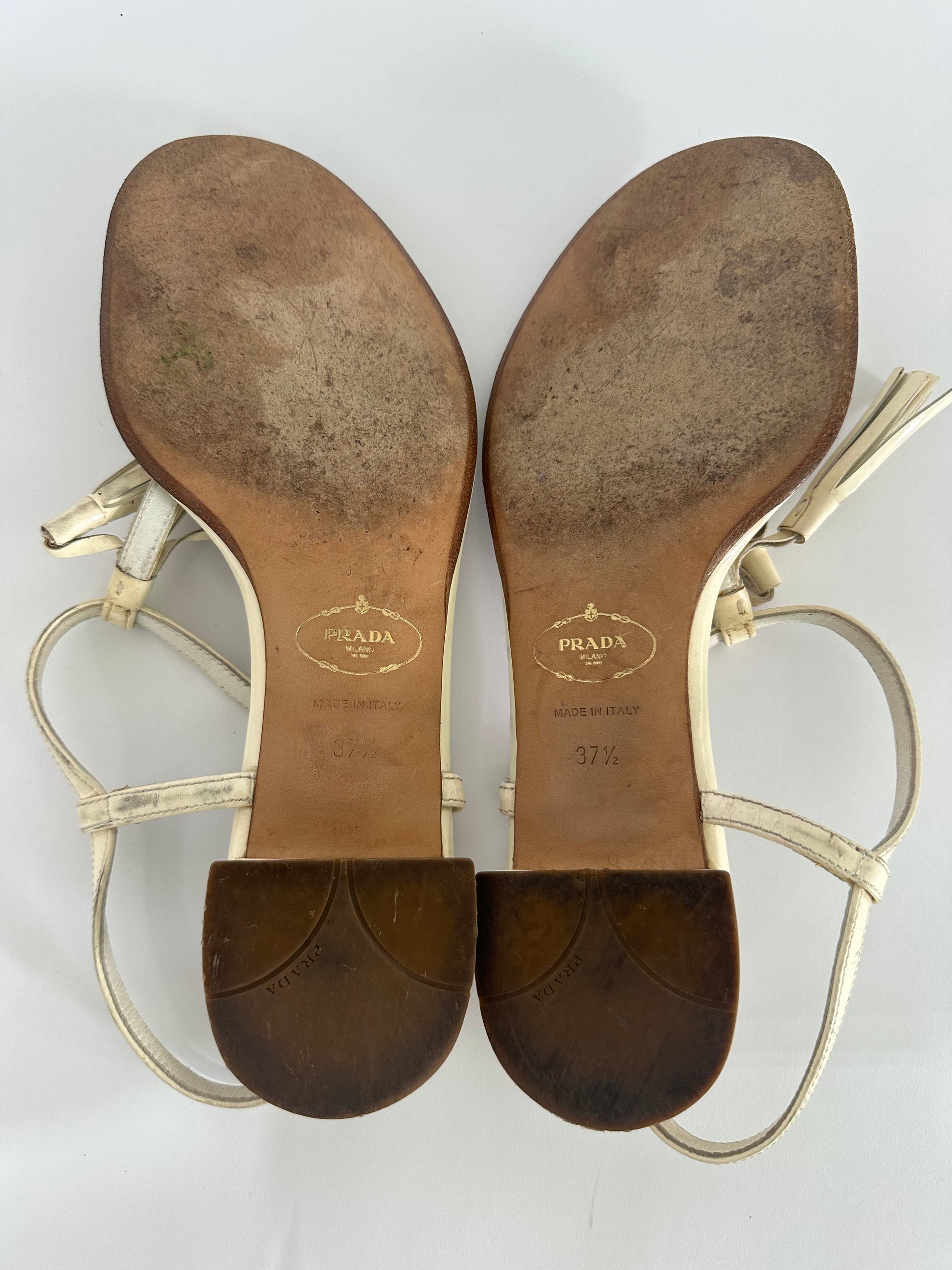 Prada Tassel Ankle T Strap Sandals White Patent Leather Thong Shoes Size 37. 5 IT