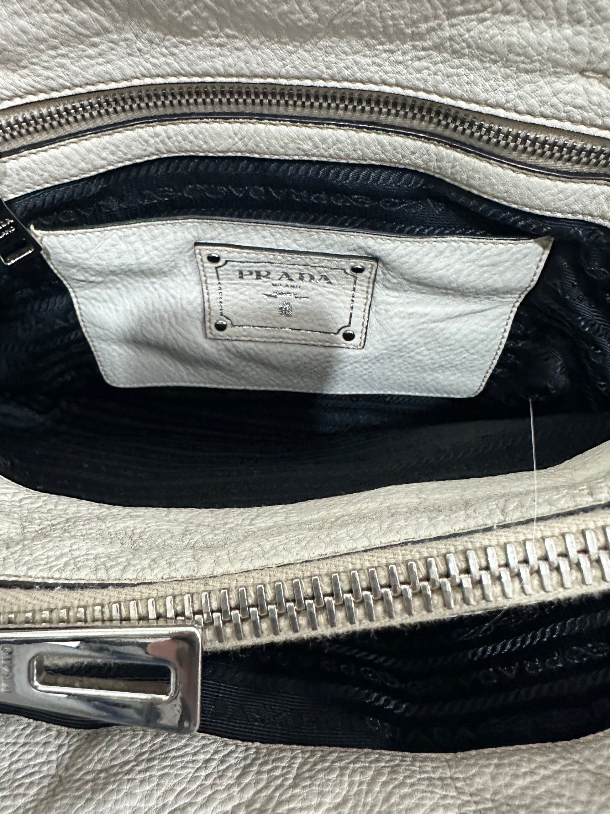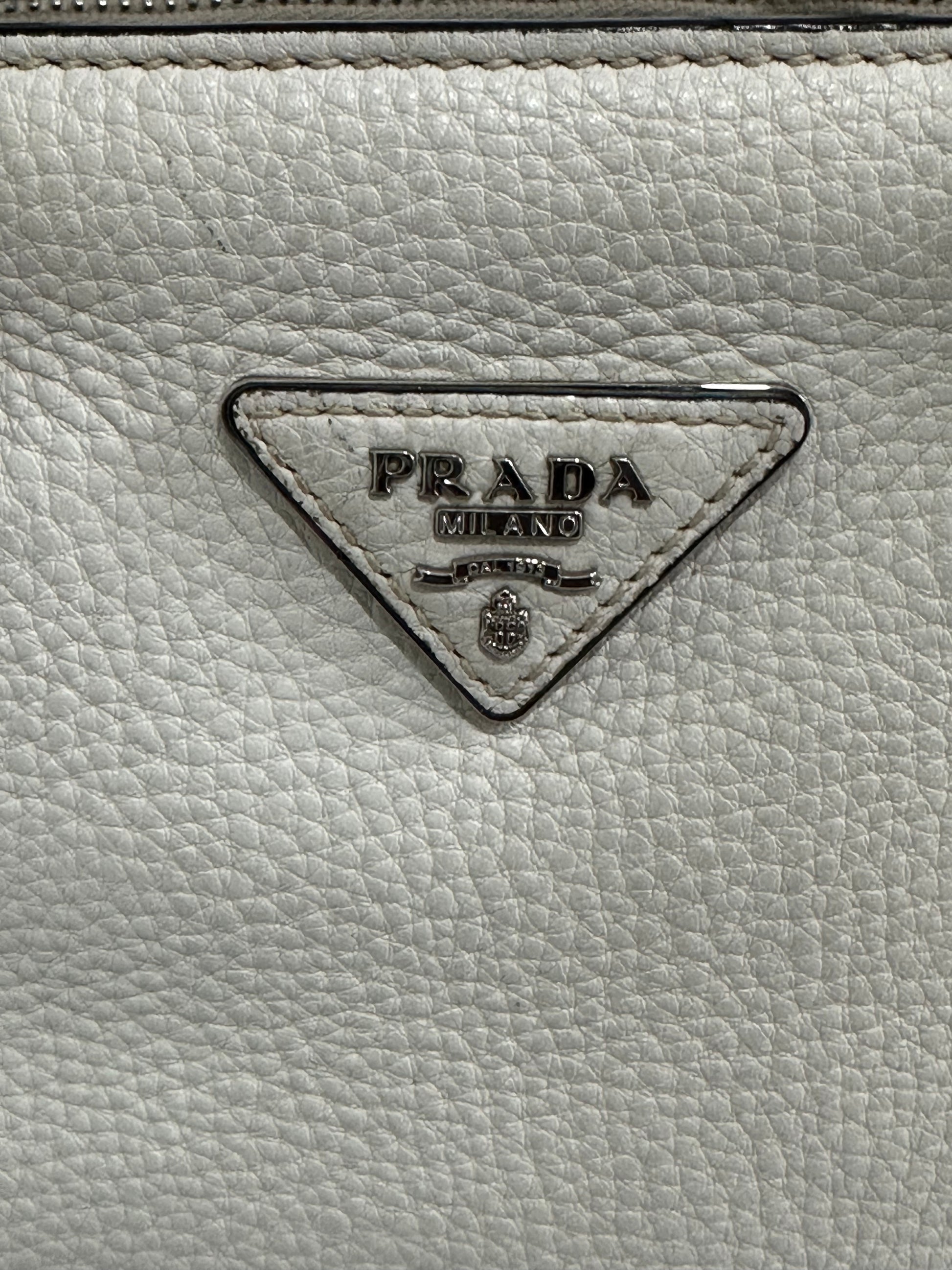 PRADA Womens Vitello Daino Large Double Zip Tote in Talco.