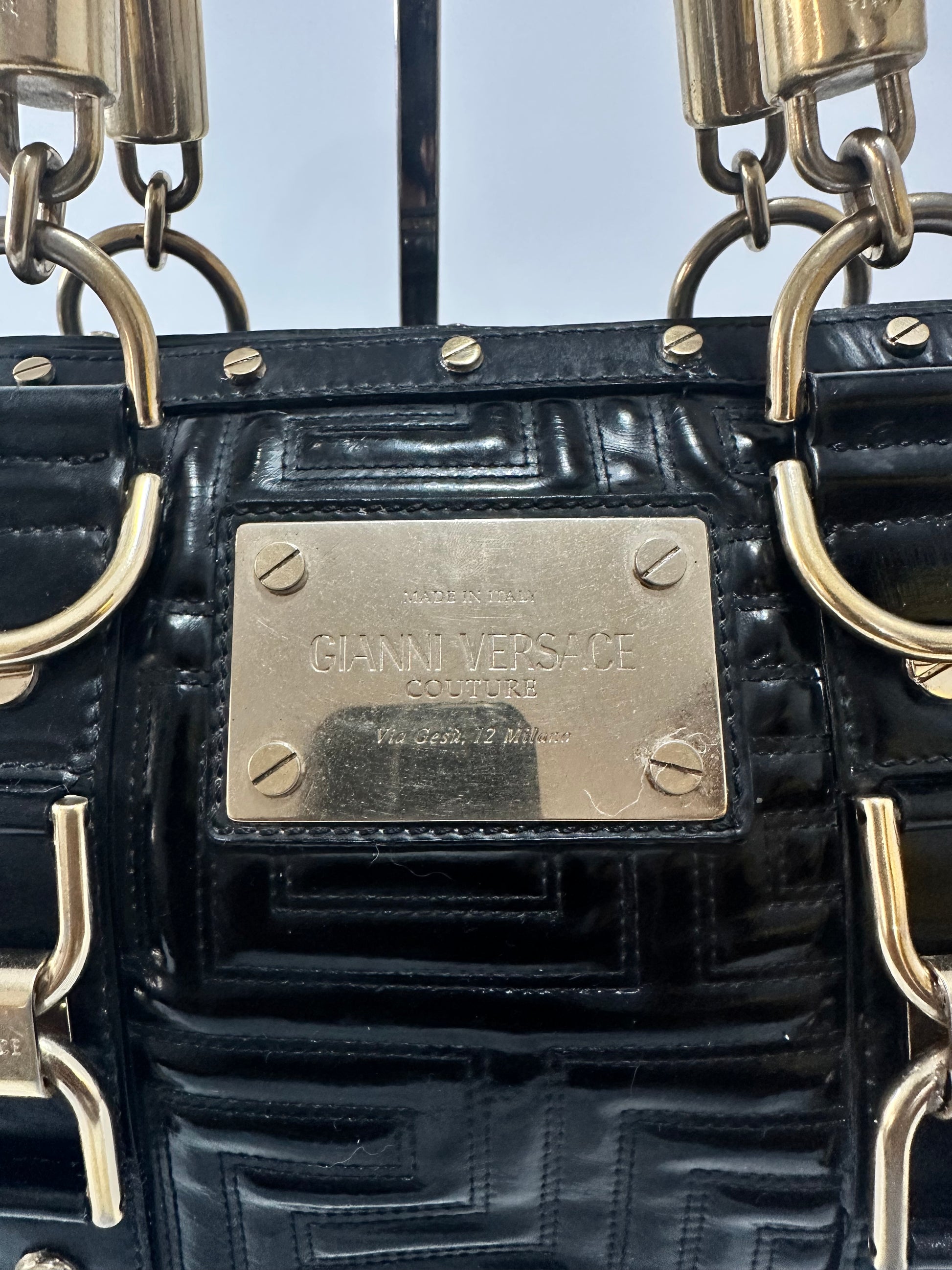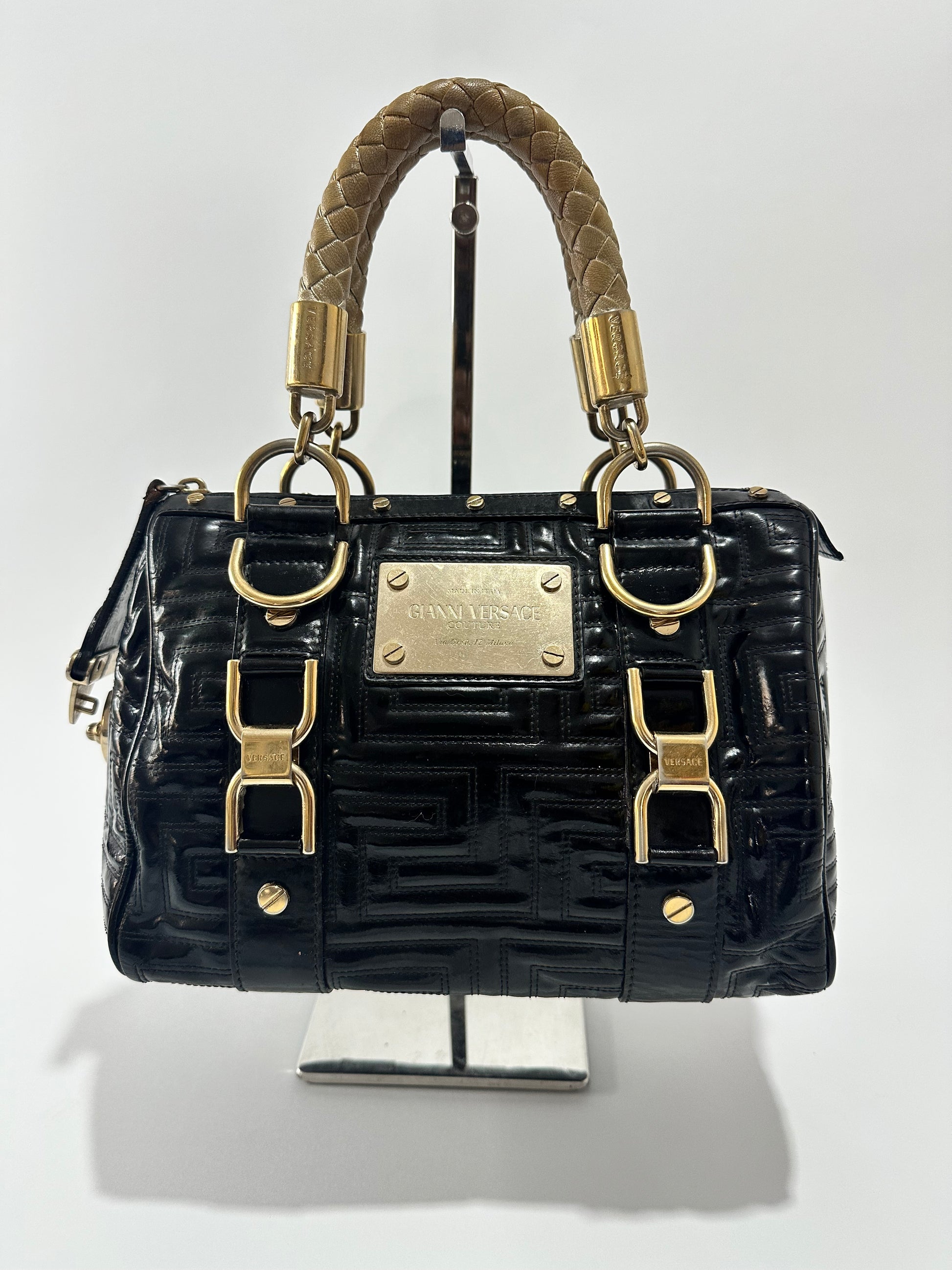 This over the top Versace Snap Out of It satchel is a bold statement making bag from the fashion forward Italian label. Crafted from black quilted Versace logo leather, it is accented with silver braided handles, a Gianni Versace Couture plate, a side pocket, gold studs and hardware. The interior is lined with black satin and features a zip pocket.