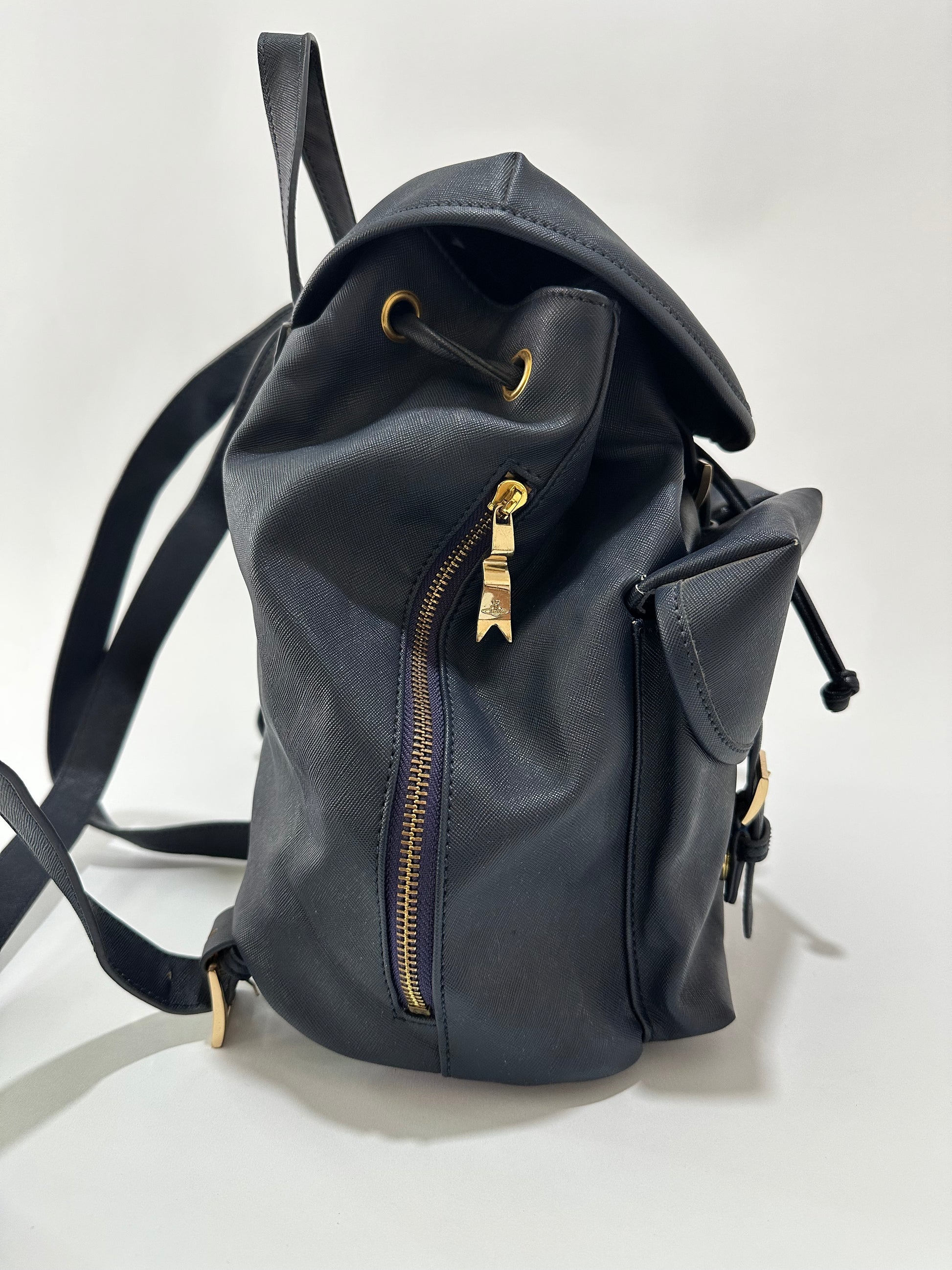 The Vivienne Westwood Blue leather Orb Backpack features gold-tone hardware, a flat handle, dual adjustable shoulder straps, leather trim embellishment, and three exterior pockets. The interior is lined with fabric and includes three pockets, all secured with a zip closure at the top.