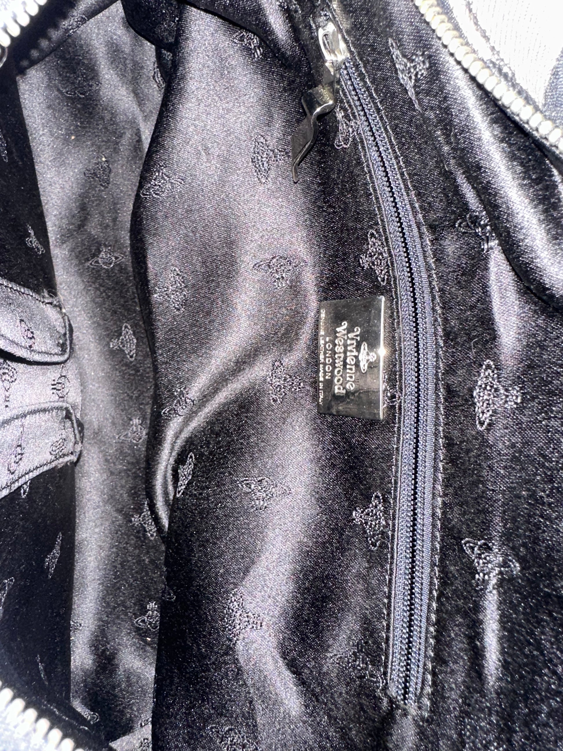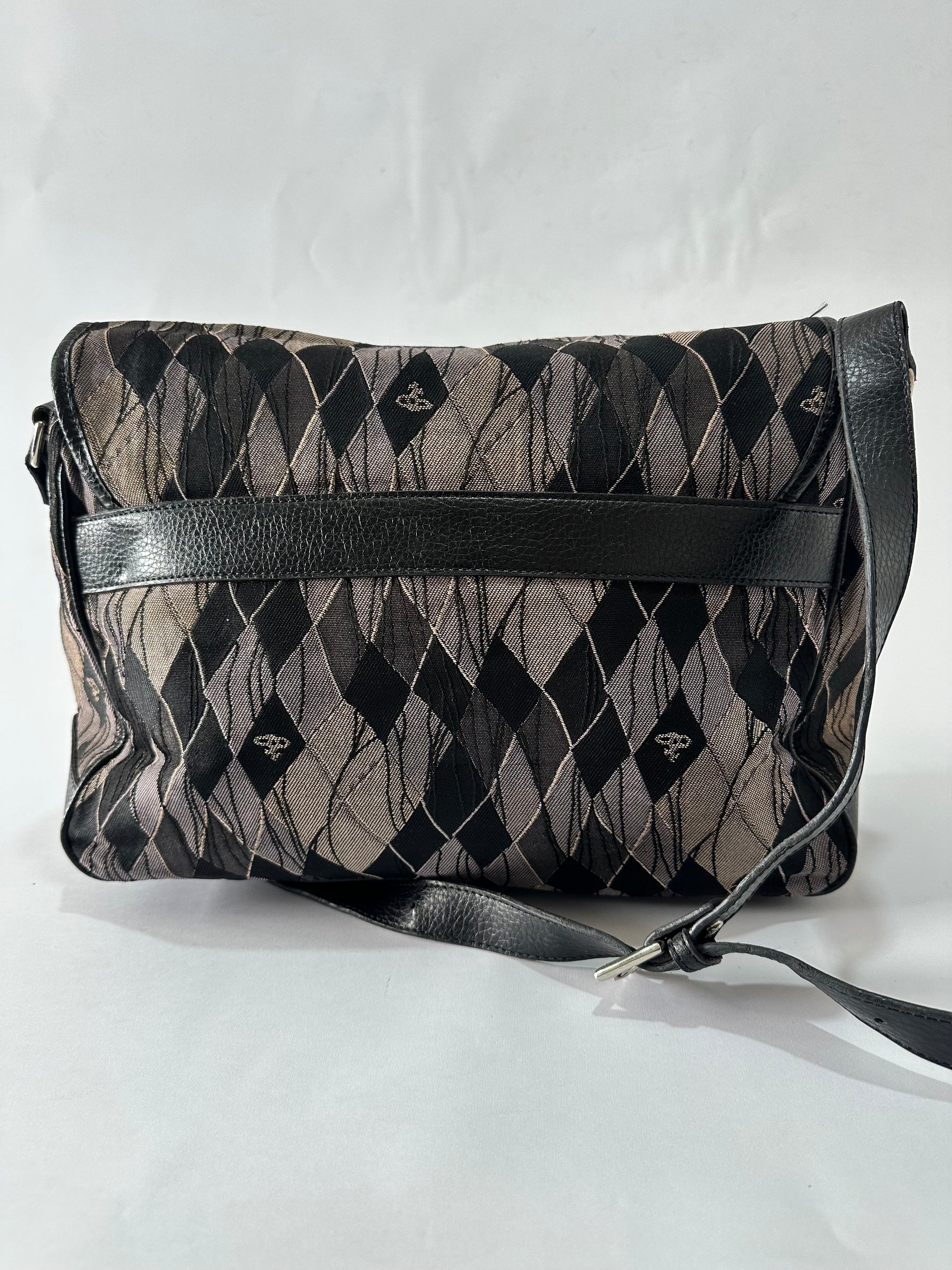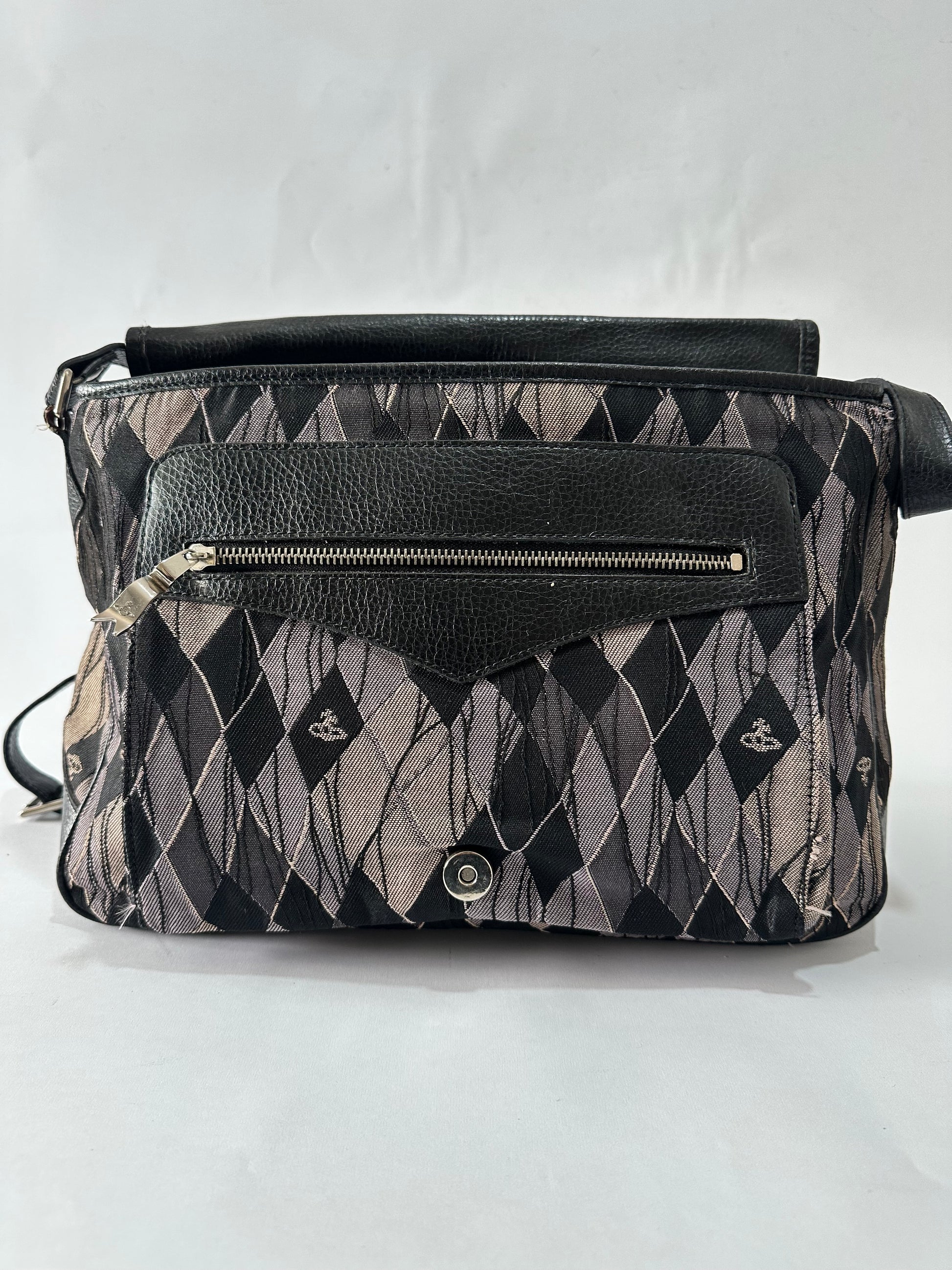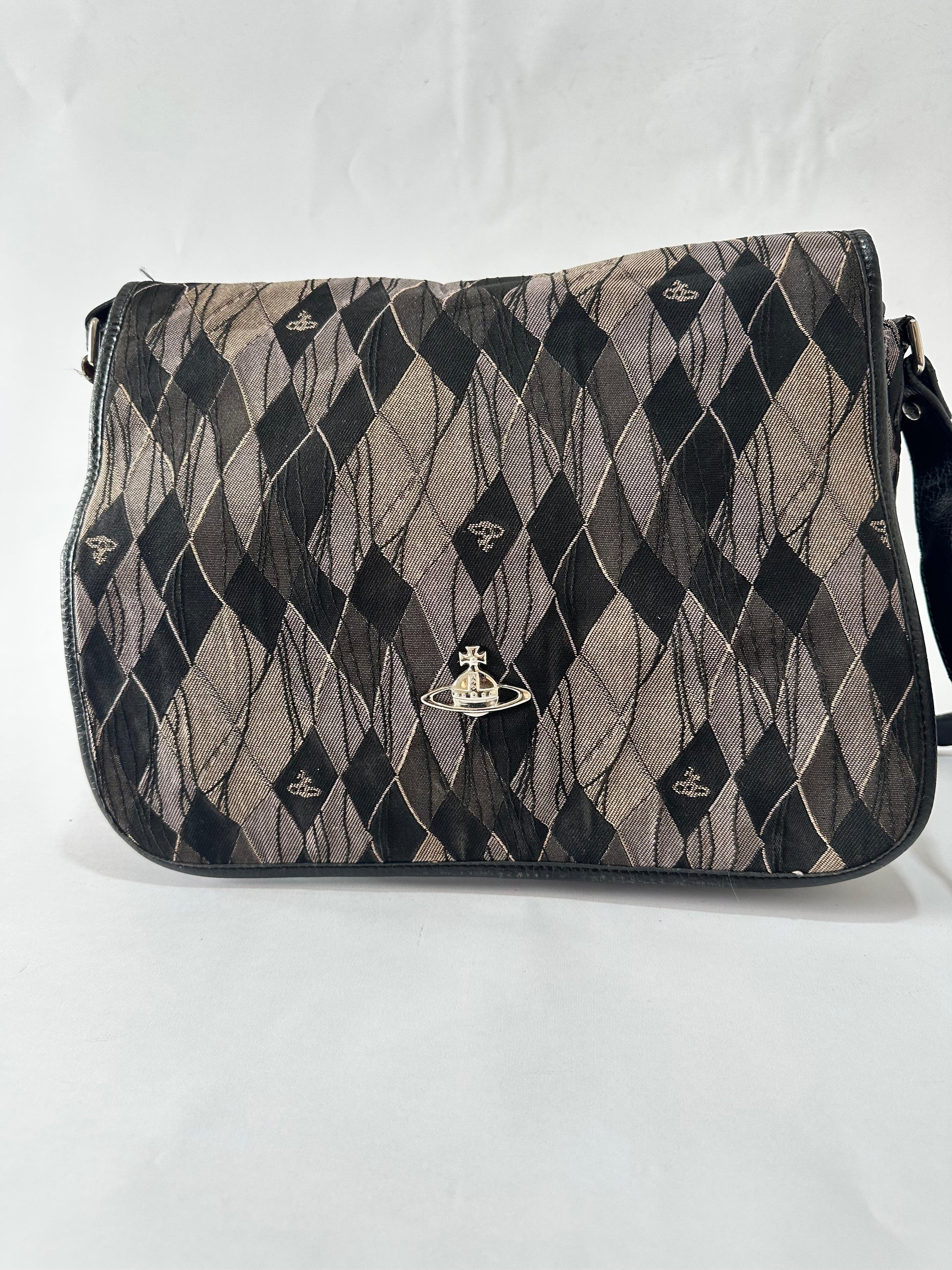 This beautiful vivienne westwood crossbody bag is made of pink checkered canvas with a pink leather strap. The bag has a flap and a top zipper which opens up to a roomy interior with a zipper pocket.