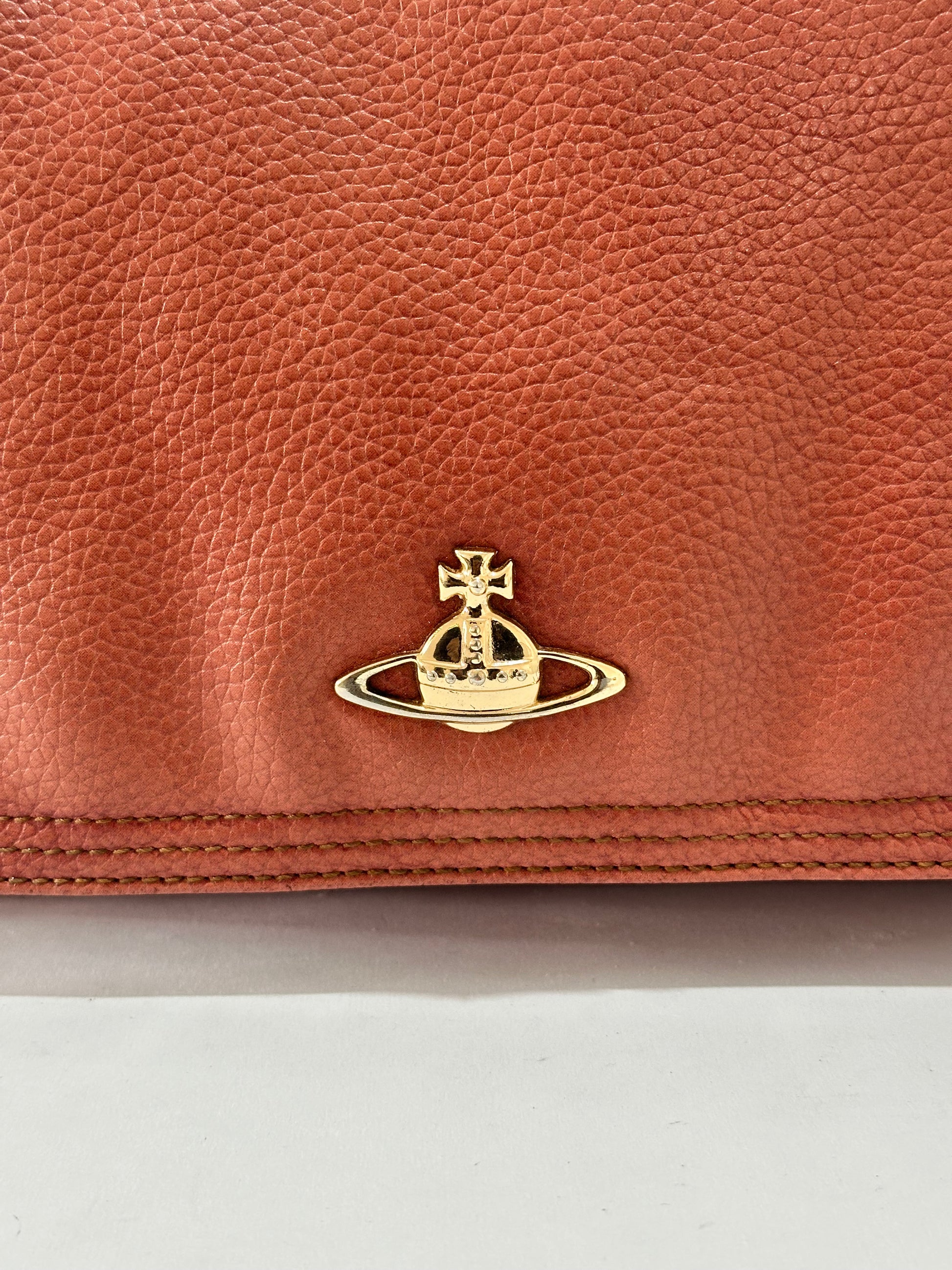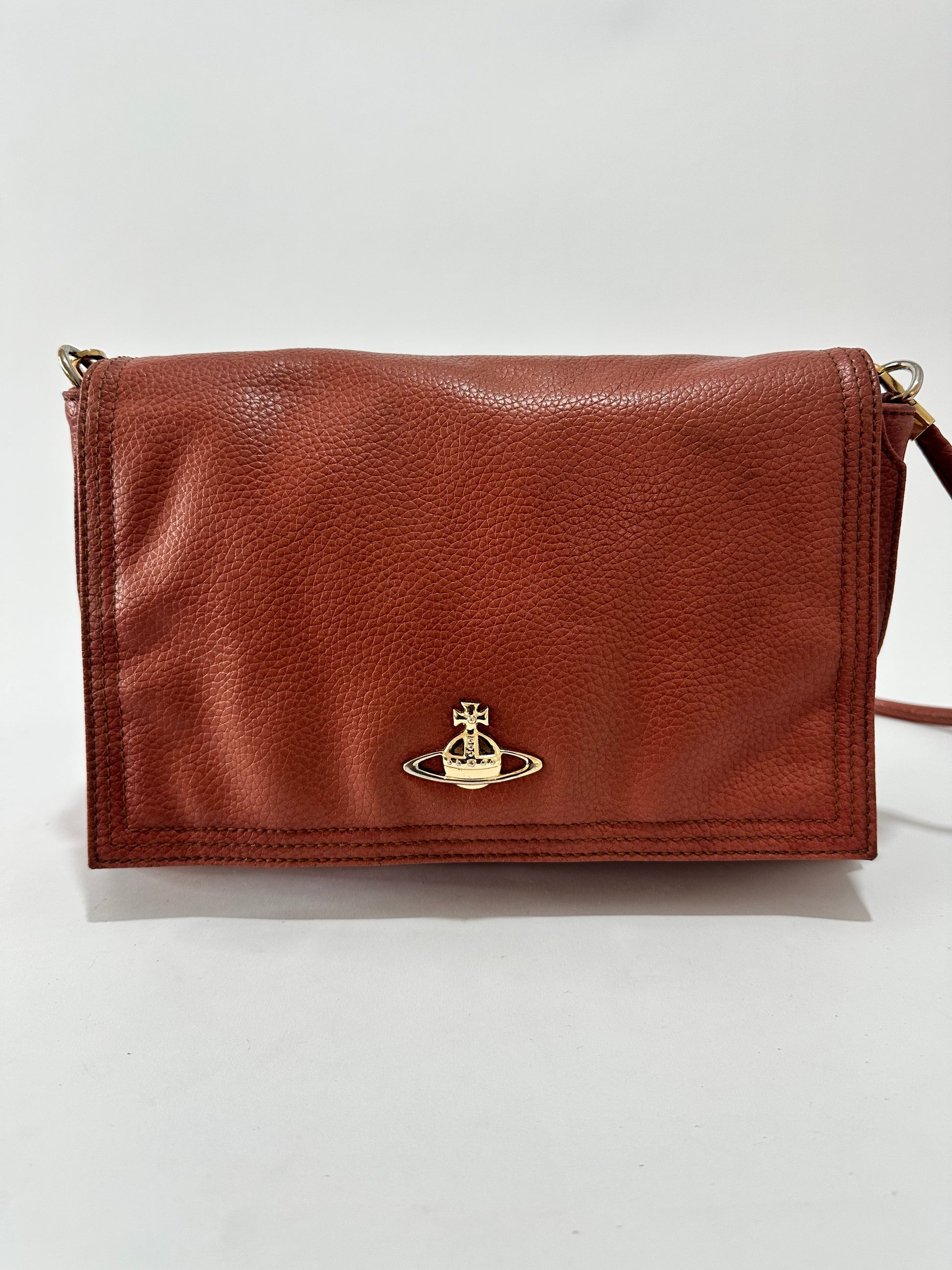 This beautiful vivienne westwood crossbody bag is made of red leather and a detachable strap. The bag has a flap which opens to a top zipper and a storage compartment.