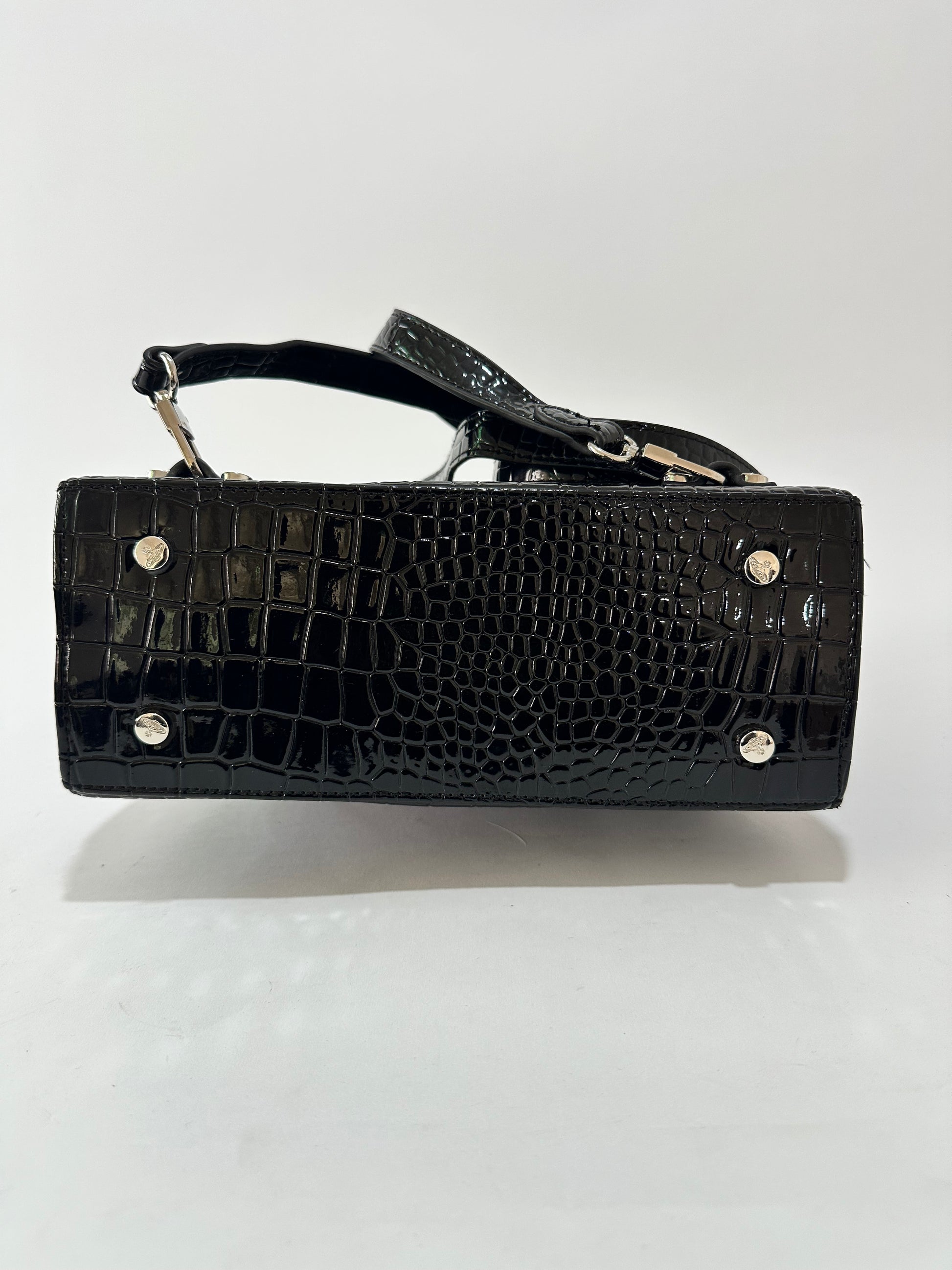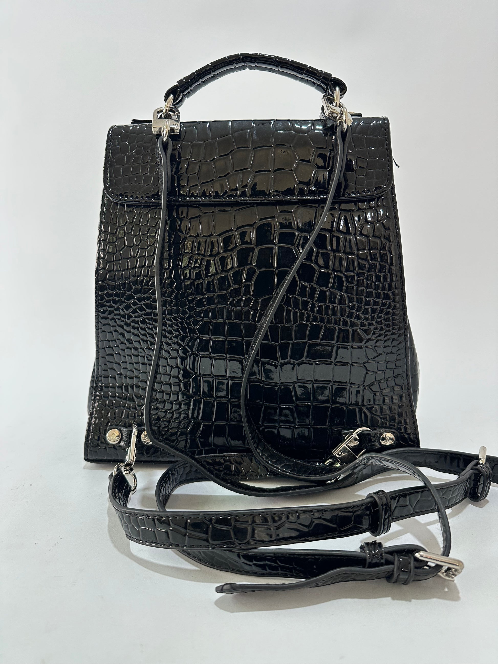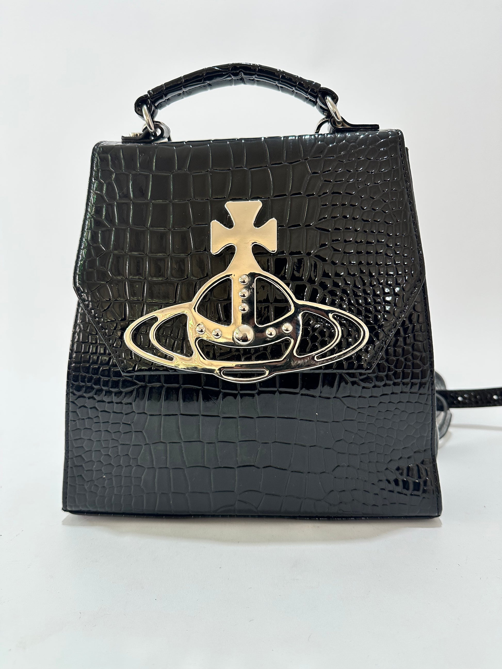 Orb-plaque embossed backpack from VIVIENNE WESTWOOD featuring black, leather, embossed crocodile effect, signature Orb plaque detail, silver-tone hardware and detachable shoulder straps.